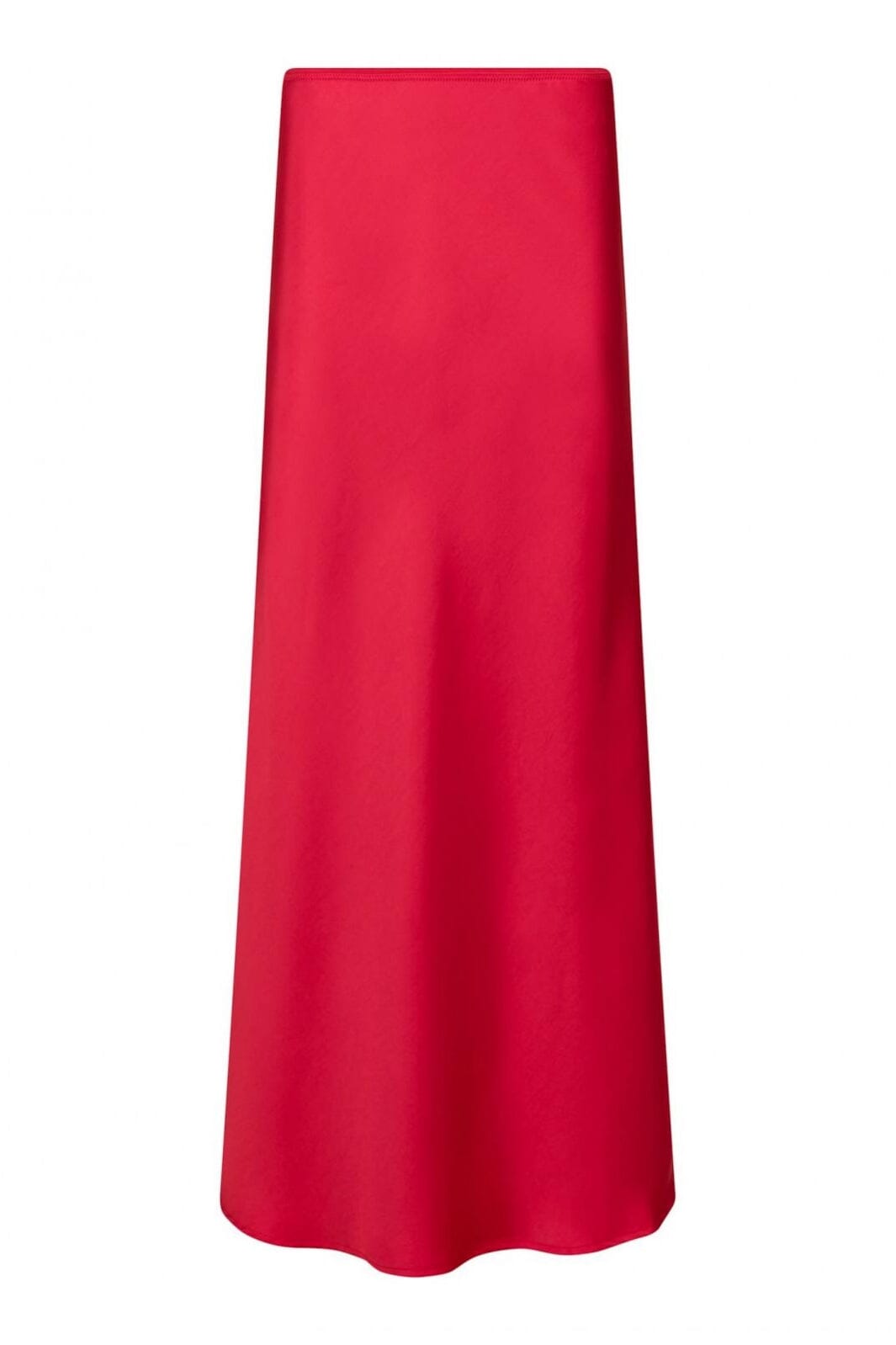 Roter Rock von Neo Noir aus weichem Satin mit schrägem Schnitt. Das lange Modell hat einen inneren Gummizug in der Taille und eine Slim Fit-Passform, die den Körperlinien folgt.