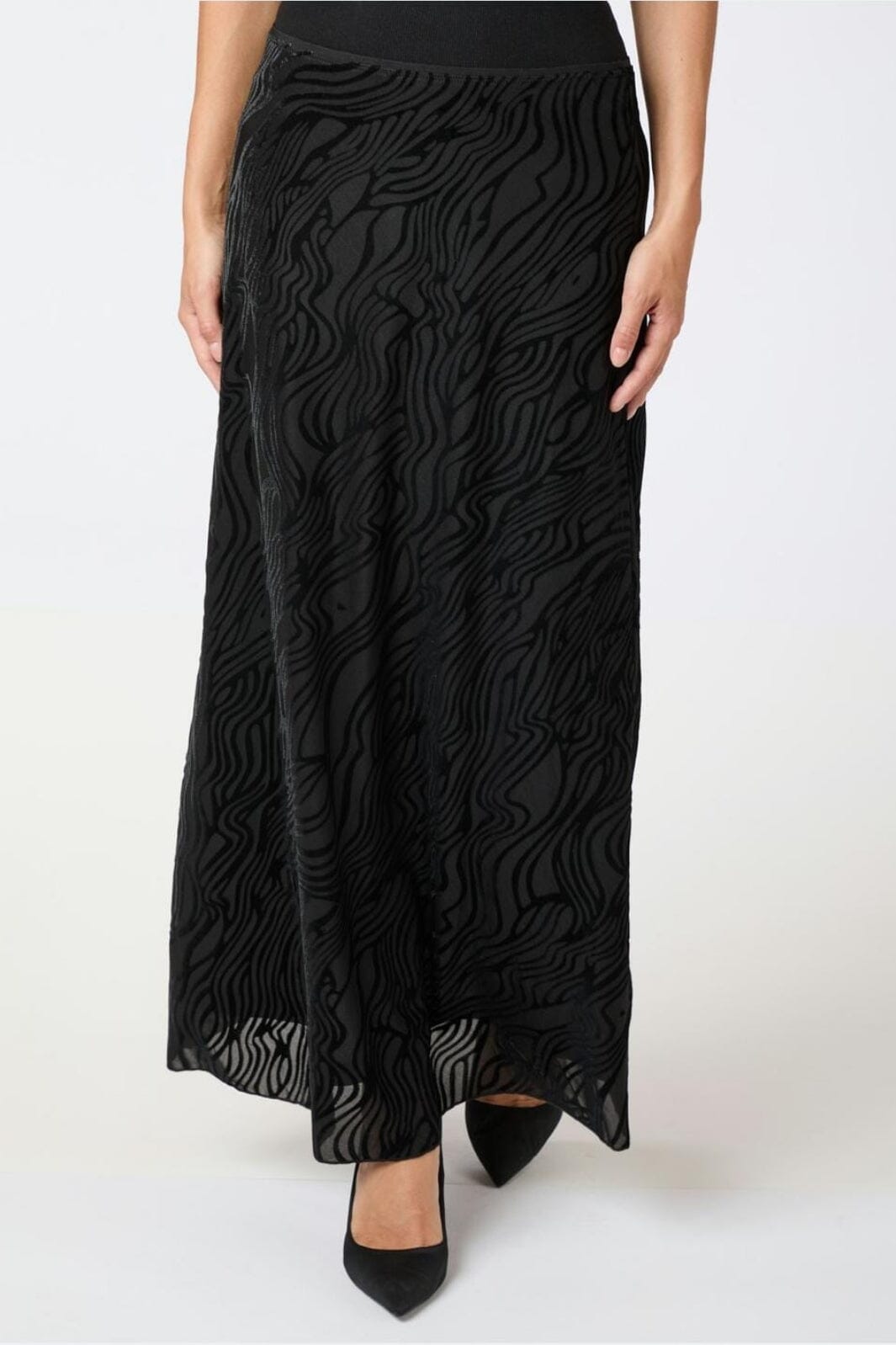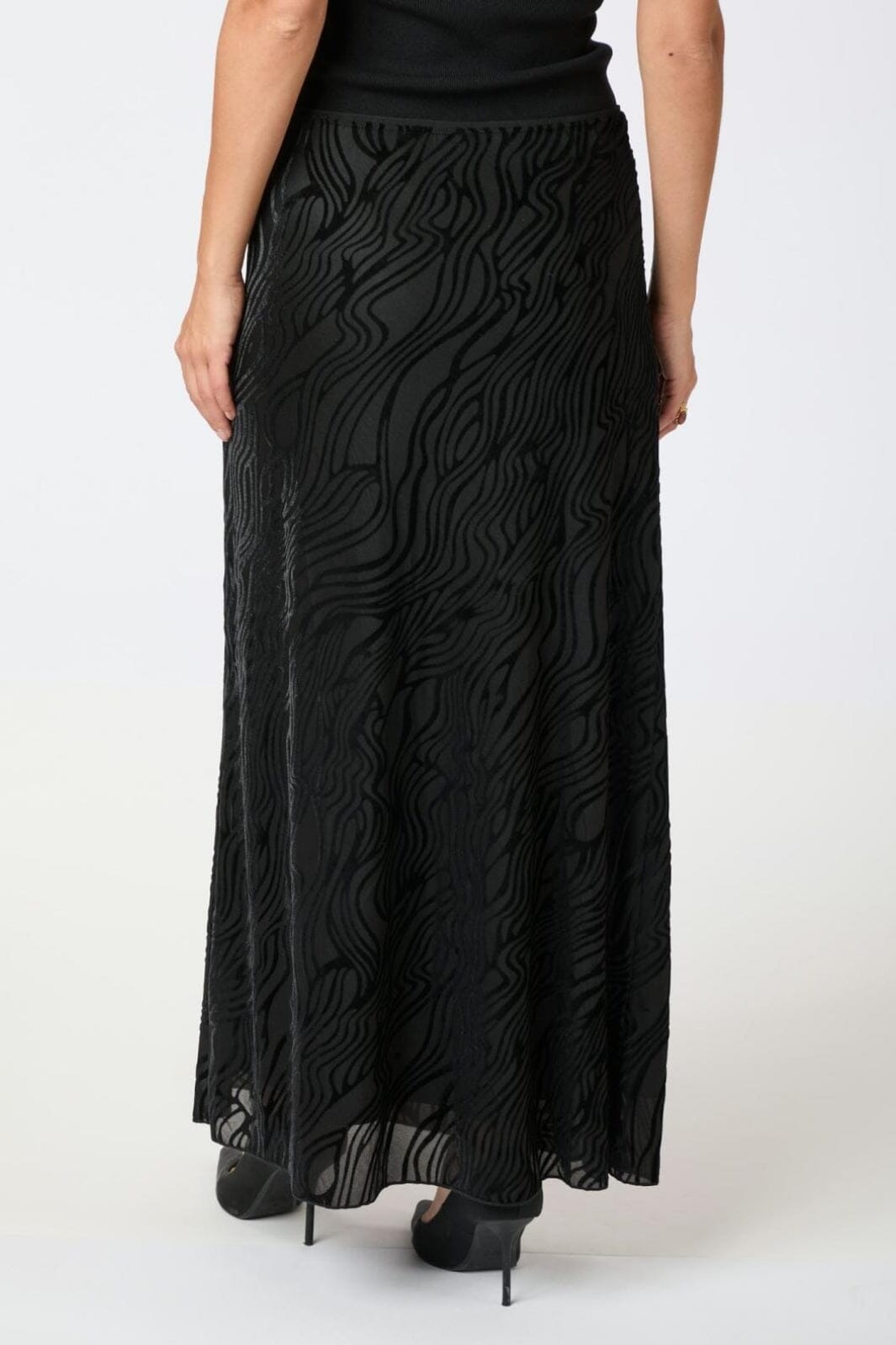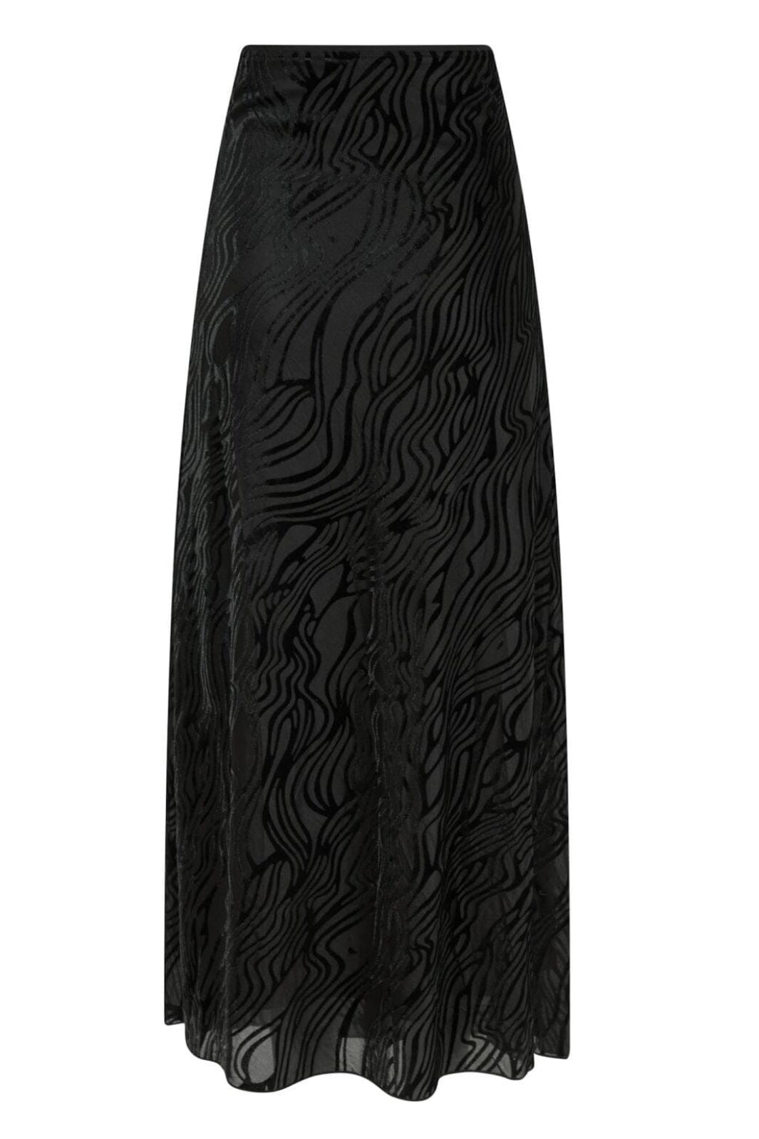 Schwarzer Rock von Neo Noir mit Zebra-Burnout-Muster. Der Stoff hat einen transparenten Effekt im Muster, der Tiefe im Design schafft. Der Rock reicht bis zum Boden und hat eine normale Taille.