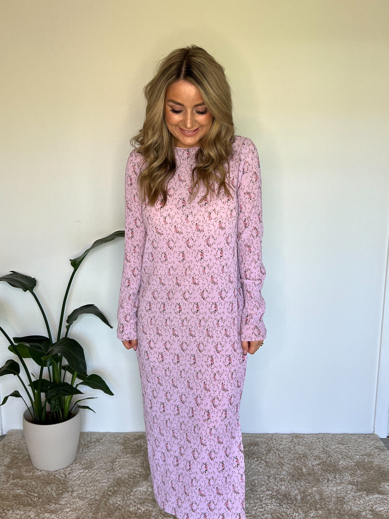Lavendelfarbenes Kleid von Neo Noir mit Blumenmuster in Rosa und Grün. Das Kleid hat plissierten Stoff und einen hohen Kragen mit langen Ärmeln.