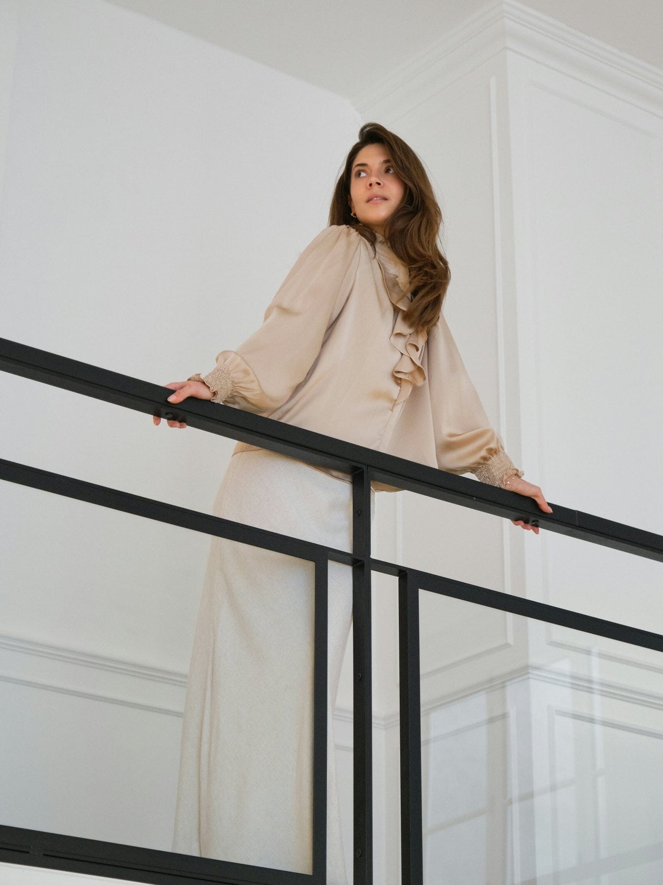 Bluse von Neo Noir in hellem Sandton, gefertigt aus 100 % Polyester. Die Bluse hat Rüschen entlang der Vorderseite und Smock-Details an den Manschetten.