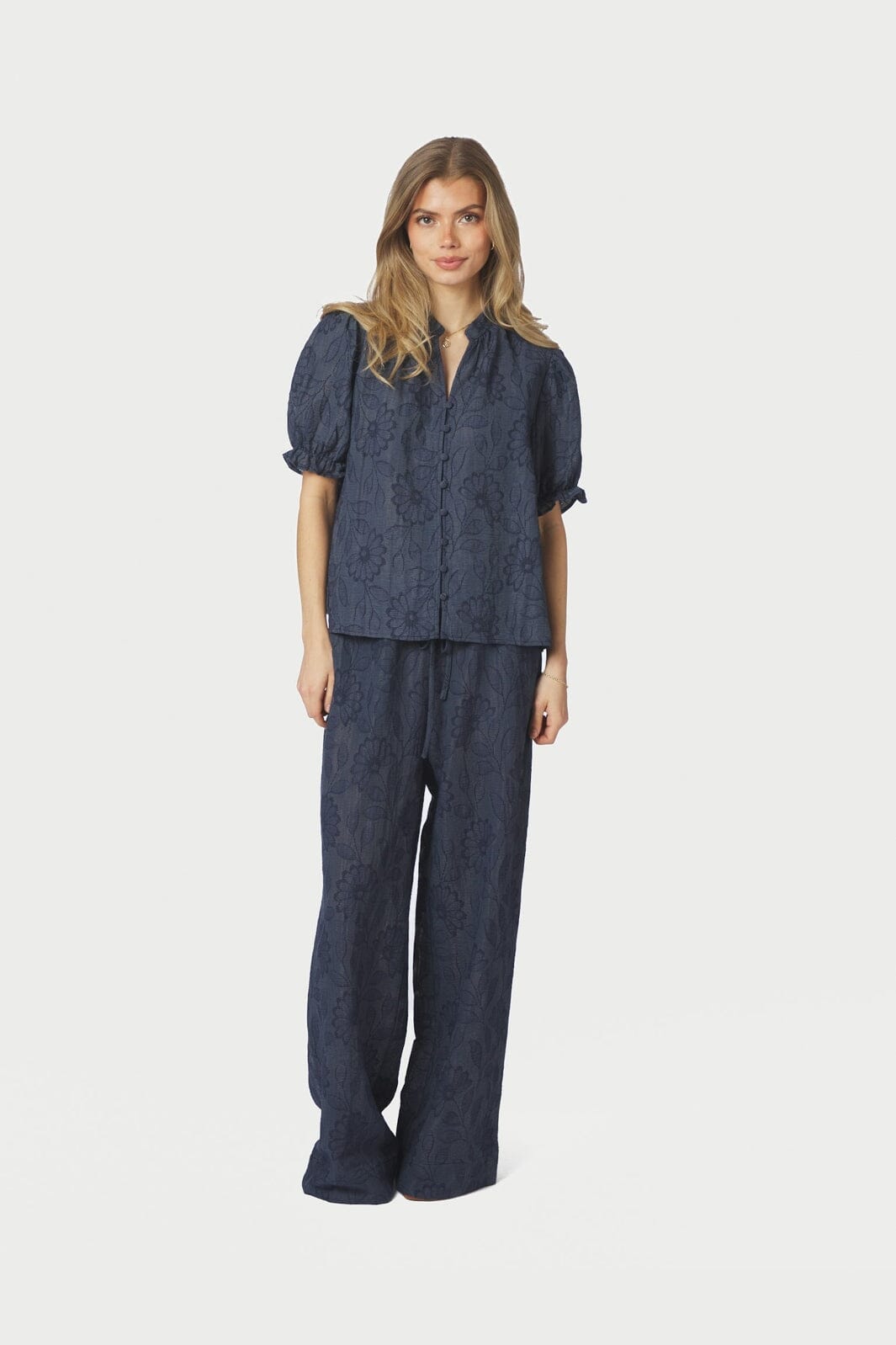Dunkelblaue Bluse von Neo Noir mit einem geblümten und gestreiften Muster. Die Bluse hat kurze Puffärmel, einen V-Ausschnitt und eine Knopfleiste vorne.