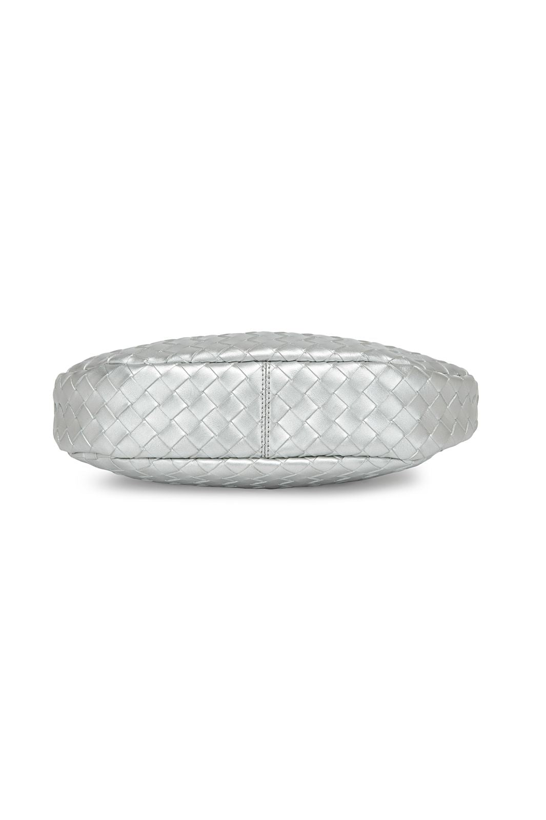 Silberfarbene Schultertasche von Noella mit gewebter Textur und flacher Halbmondform. Die Tasche besteht aus Polyurethan und hat Details in gebürstetem Silber.