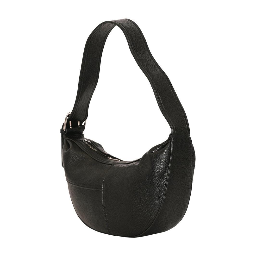 Schwarze Schultertasche von Noella mit gebogener Form und strukturierter Oberfläche. Die Tasche hat ein geräumiges Innenfach und einen praktischen Reißverschluss oben.
