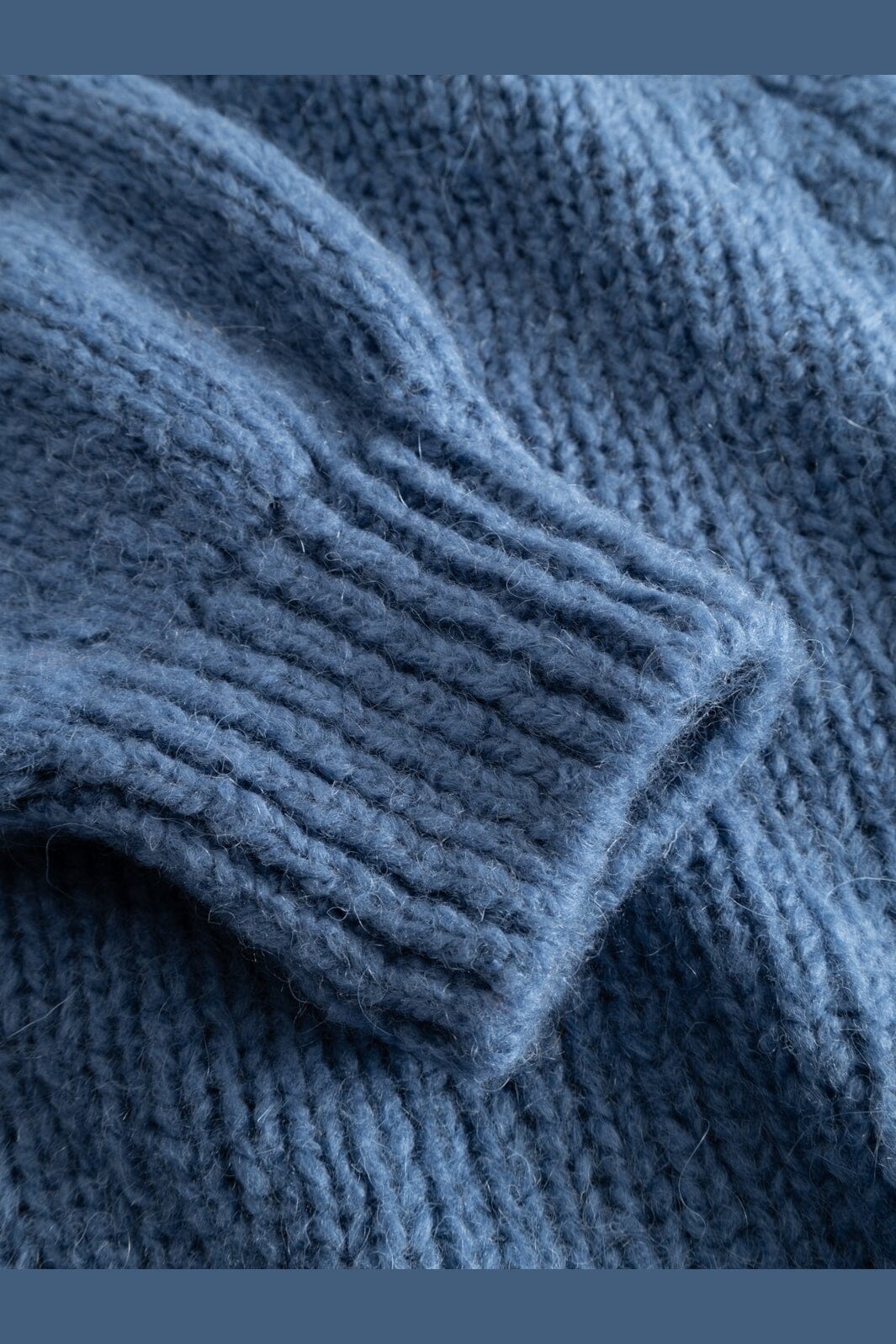 Indigo Cardigan von Noella mit V-Ausschnitt und Ballonärmeln. Der dichte Strick macht sie das ganze Jahr über tragbar, und sie hat breite Rippbündchen an den Ärmeln und entlang des Saums.