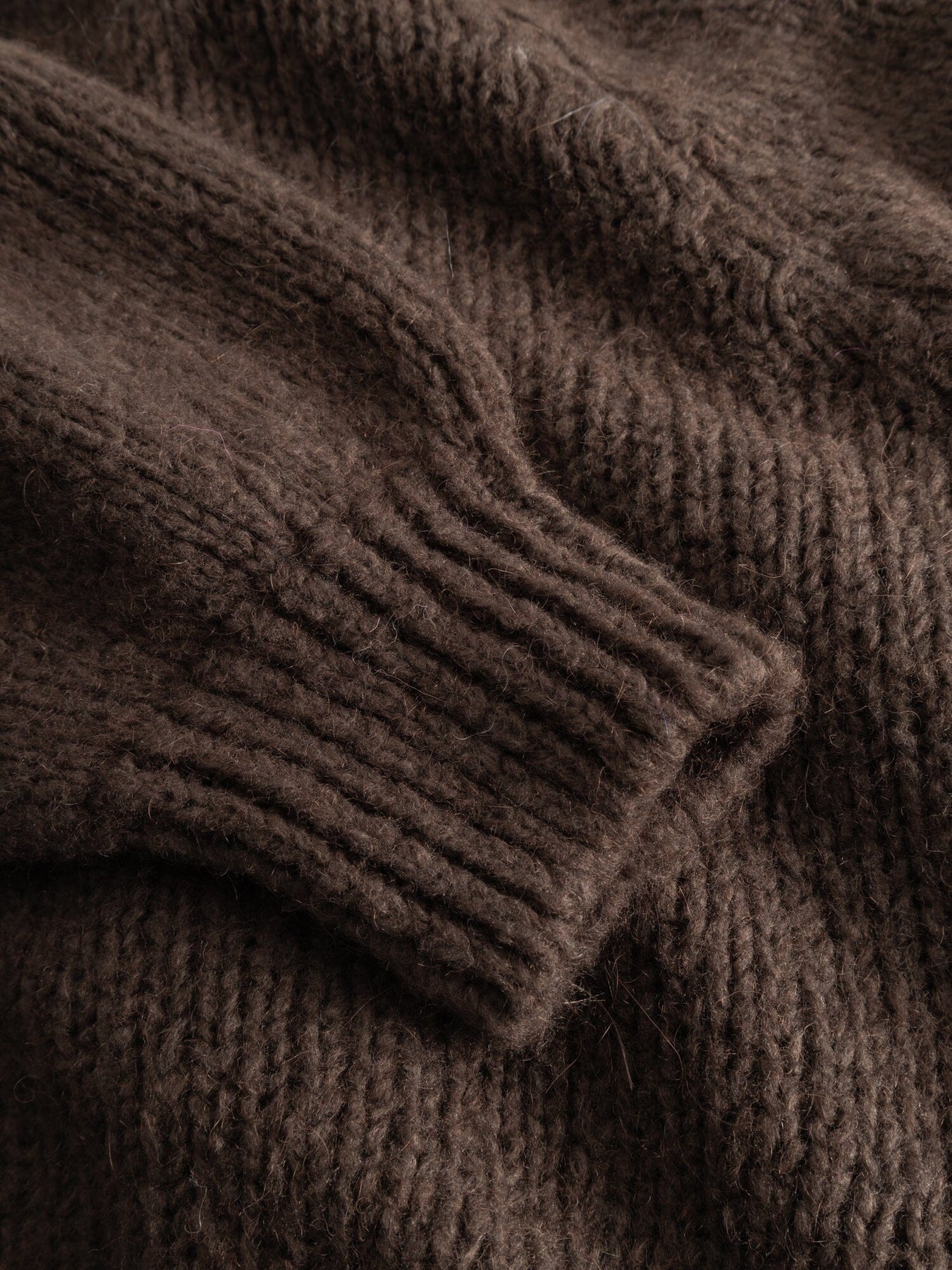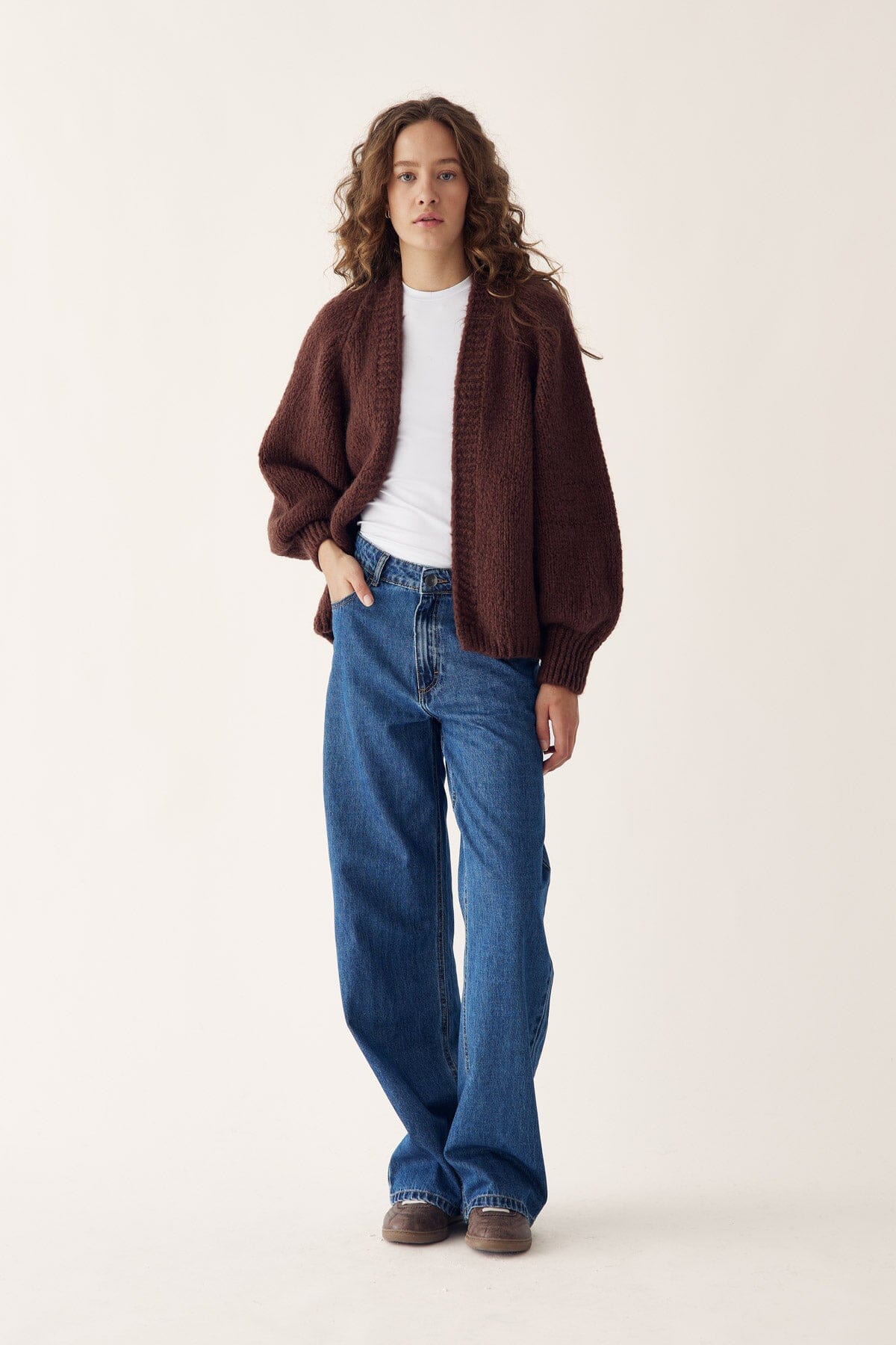 Dunkelbraune Cardigan von Noella aus einer weichen Materialmischung mit Mohair und Wolle. Die lockere Passform und die langen Ärmel bieten viel Platz für Layering-Styling.