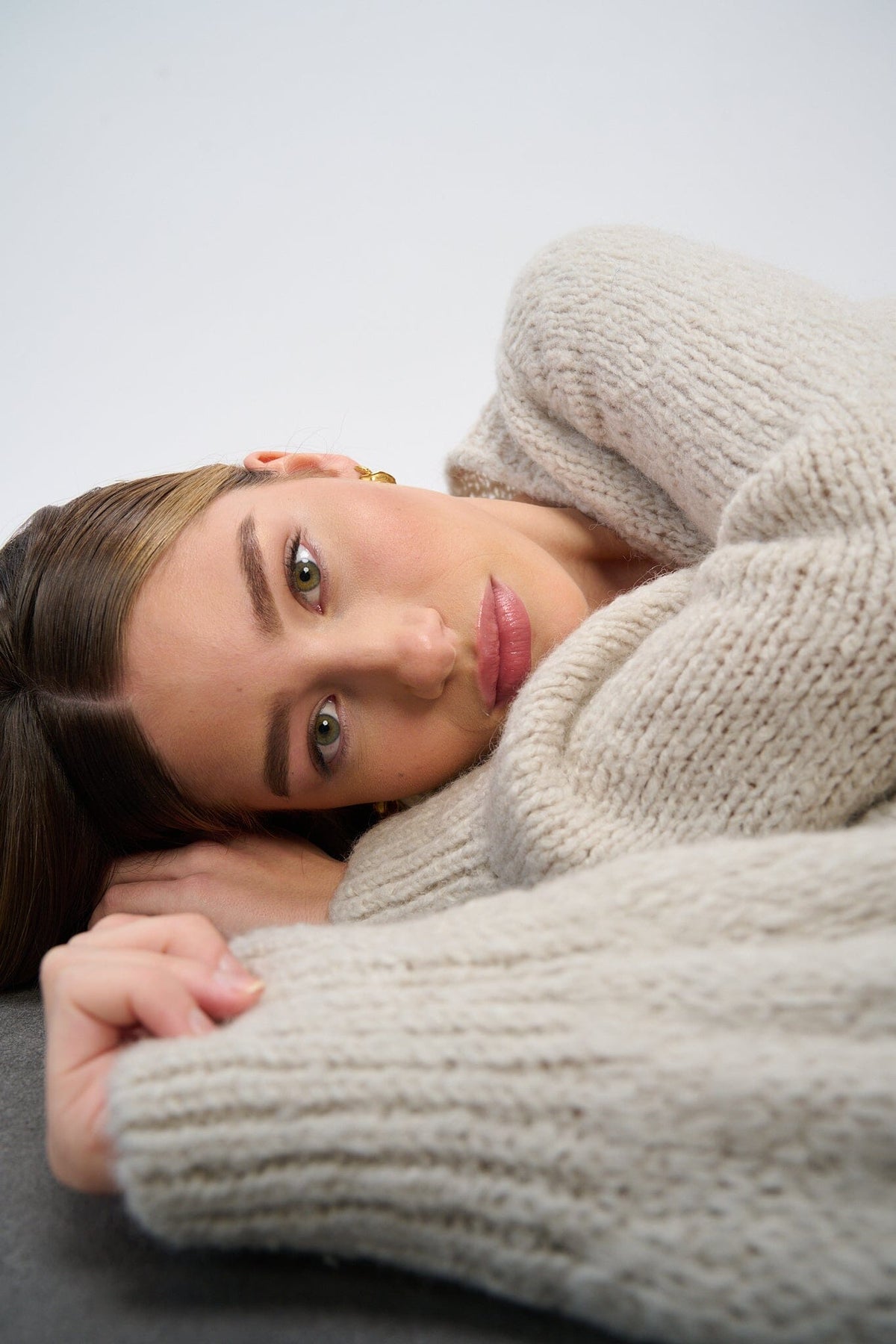 Sandfarbener Cardigan von Noella mit grober Strick und V-Ausschnitt. Das dicke Strickmuster bietet sowohl Wärme als auch Charakter, während die lockere Passform eine entspannte Silhouette schafft.