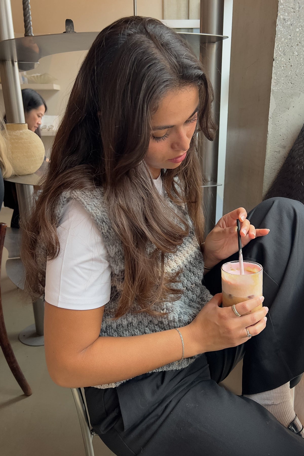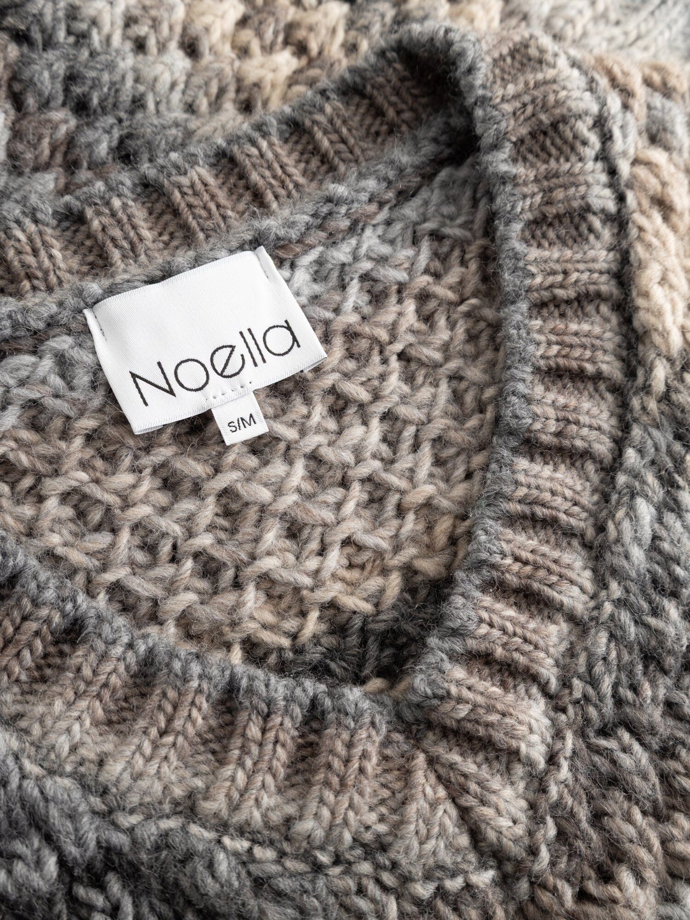 Strickweste von Noella in hellgrauen und beigen Nuancen. Die Weste hat einen groben Strickstil mit einem melierten Streifenmuster.