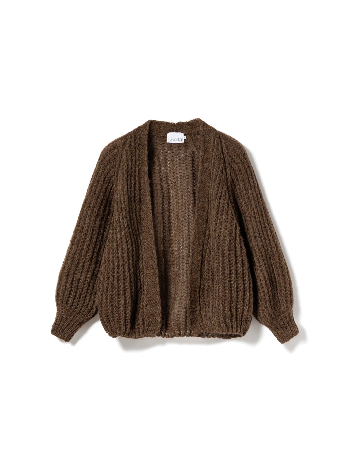 Brauner Strickcardigan von Noella mit offenem Strukturmuster. Das lockere Modell hat ballonförmige Ärmel und eine offene Front ohne Verschluss. Es ist in einem melierten schokoladenbraunen Farbton gestrickt.