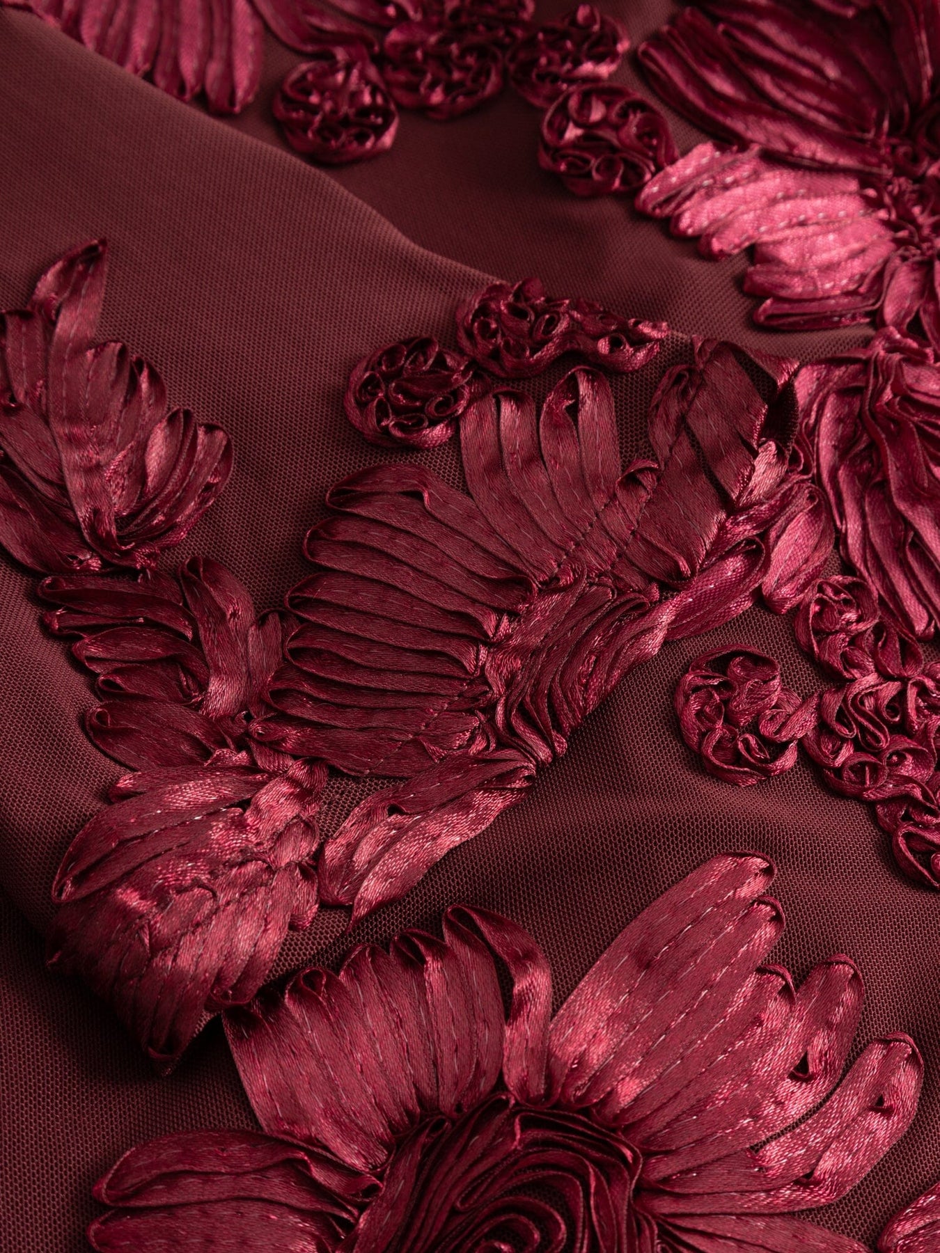 Knöchellanges Kleid von Noella in weinrot mit 3D-Blumenprint. Es hat einen V-Ausschnitt, 3/4-Ärmel und eine detaillierte Stickerei mit Rüschen.