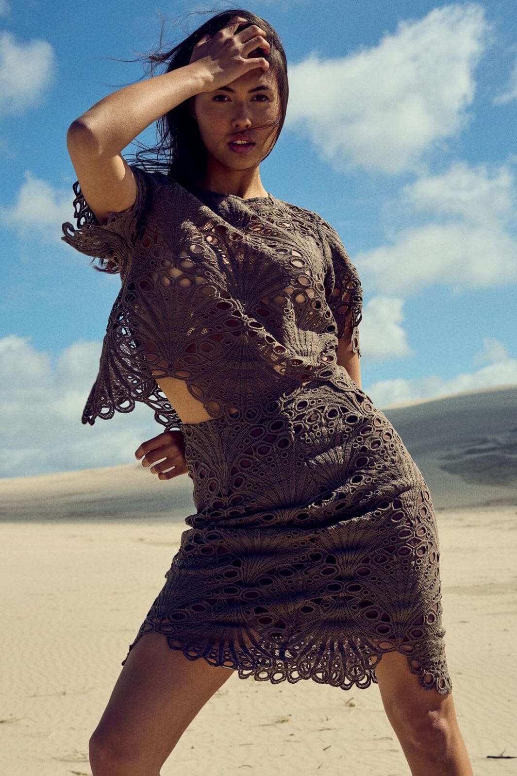 Brauner Spitzenrock von Noella mit Blumenmuster. Der hochgeschnittene Rock hat eine kurze Länge und ein detailliertes Spitzen-Design mit Ausschnitten, die ein schönes Muster erzeugen.
