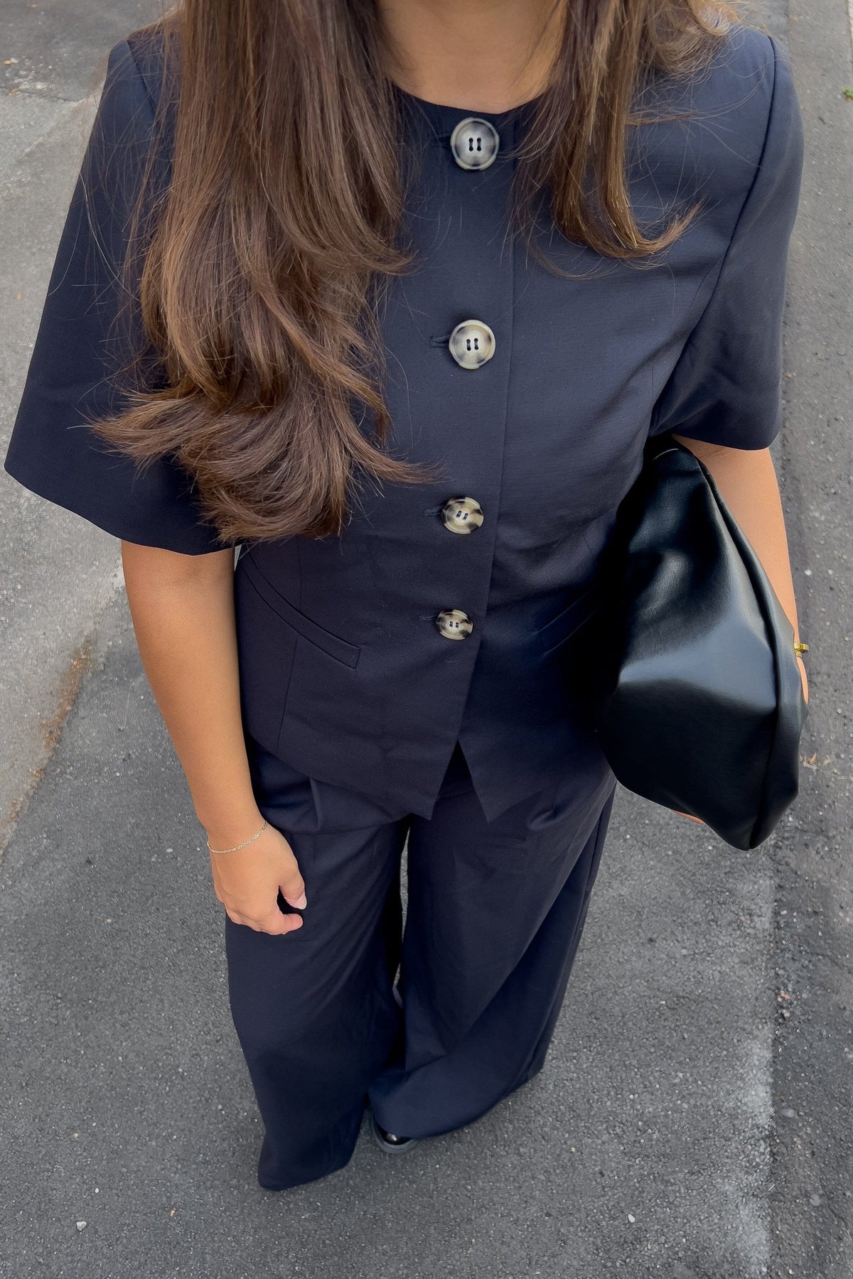 Schwarzer Blazer von Noella mit kurzen Ärmeln und rundem Ausschnitt. Große Knöpfe zieren die Vorderseite, und zwei Seitentaschen verleihen dem Blazer ein praktisches Design.