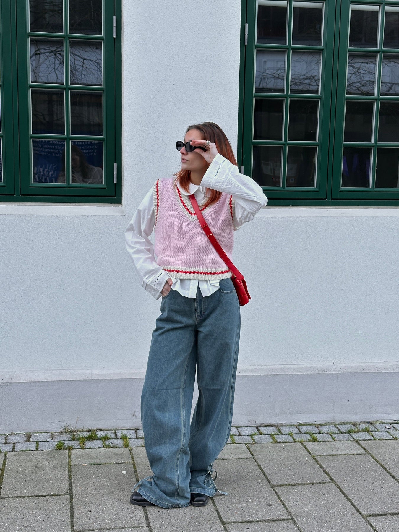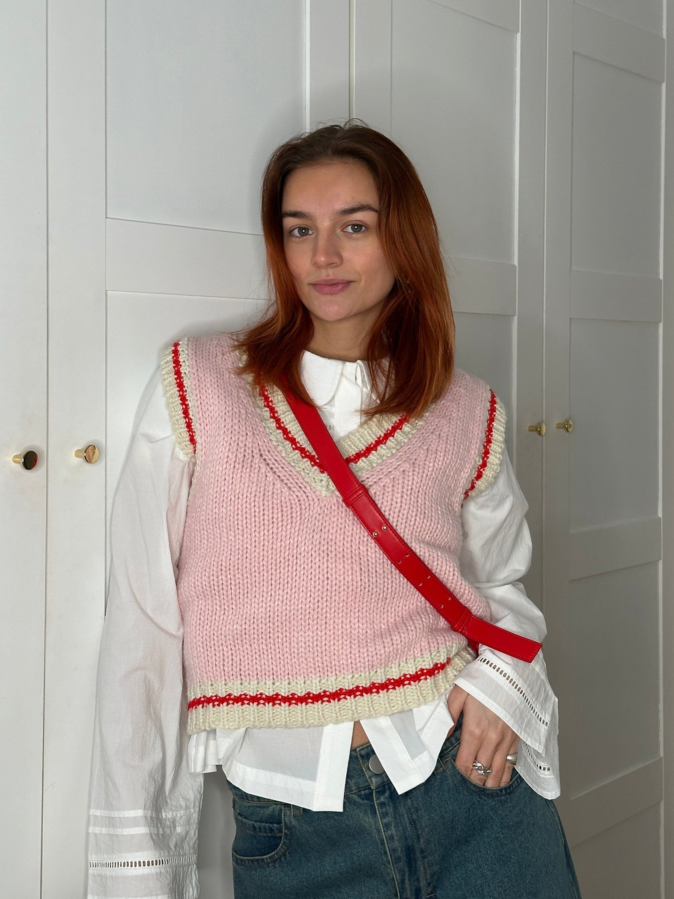 Strickweste von Noella in Pink und Creme mit roten Streifen. Sie hat einen V-Ausschnitt und ist ärmellos. Die Weste ist aus einem dicken Garn mit einem gestreiften Muster gestrickt.