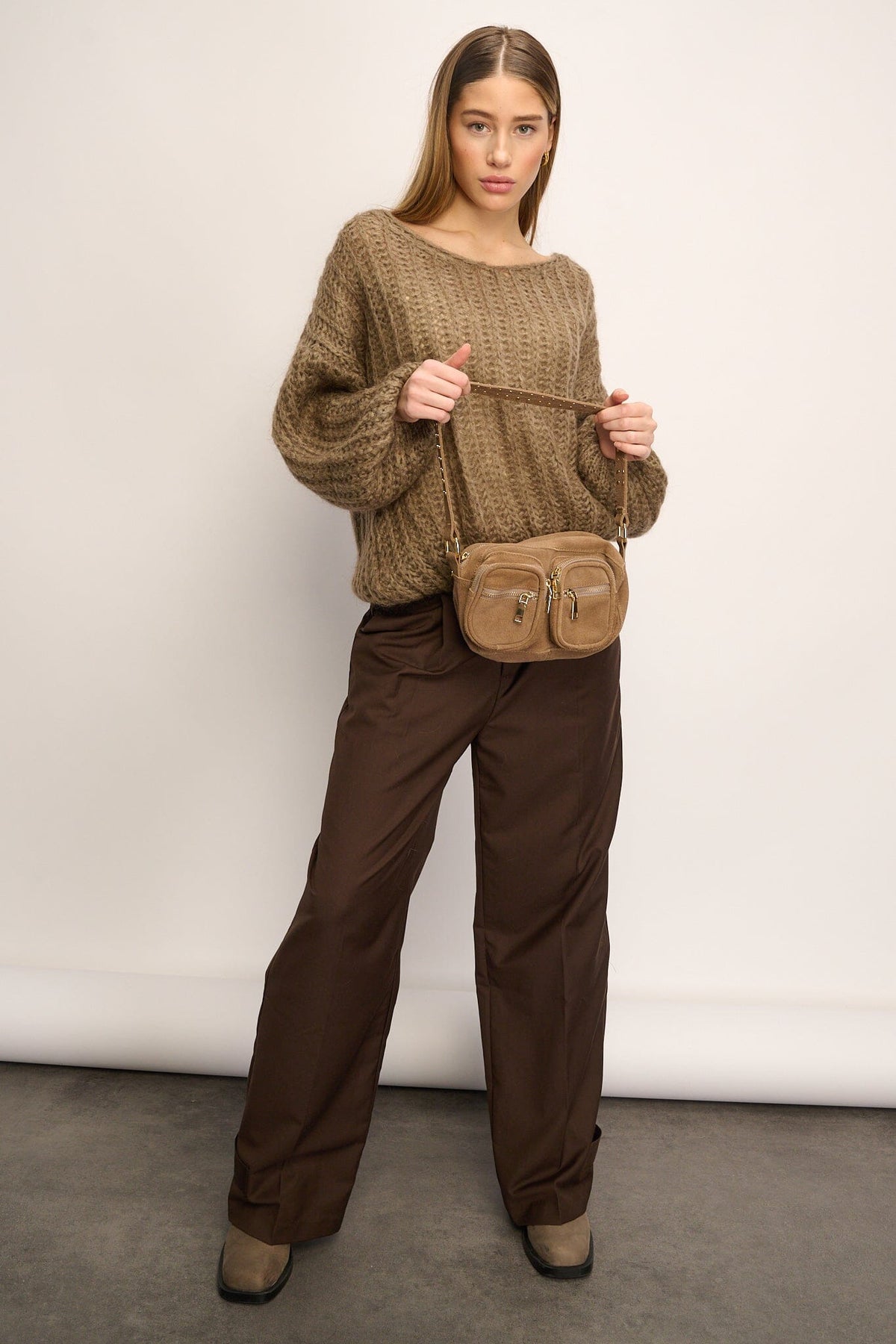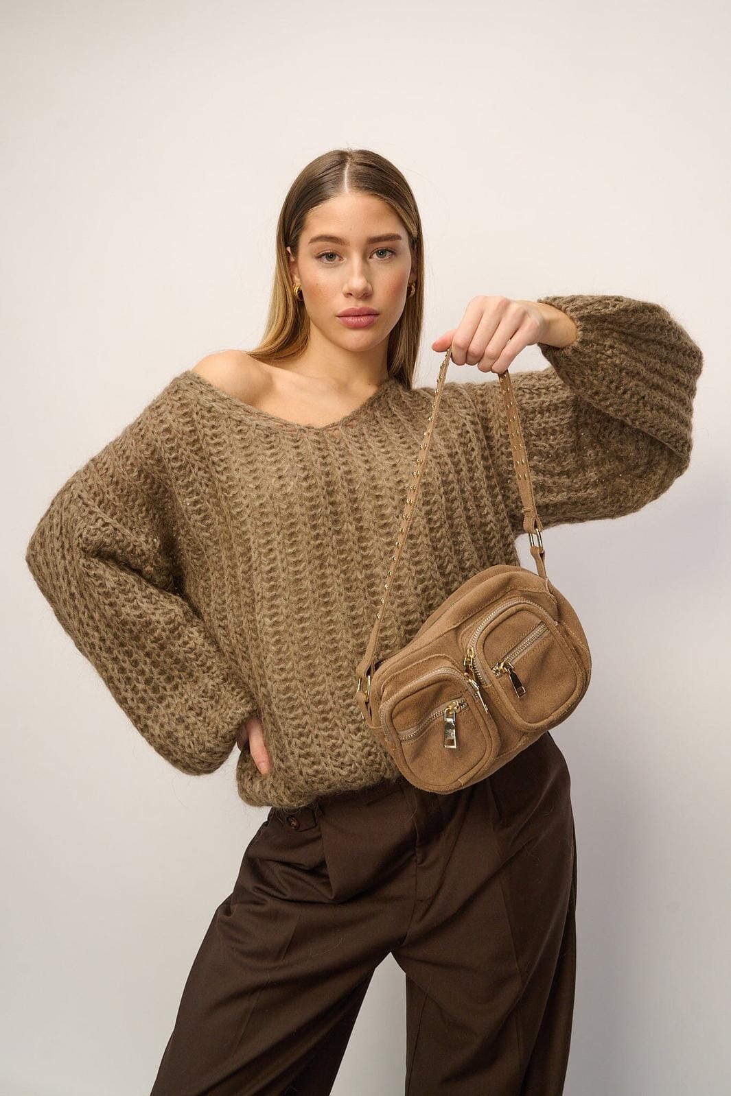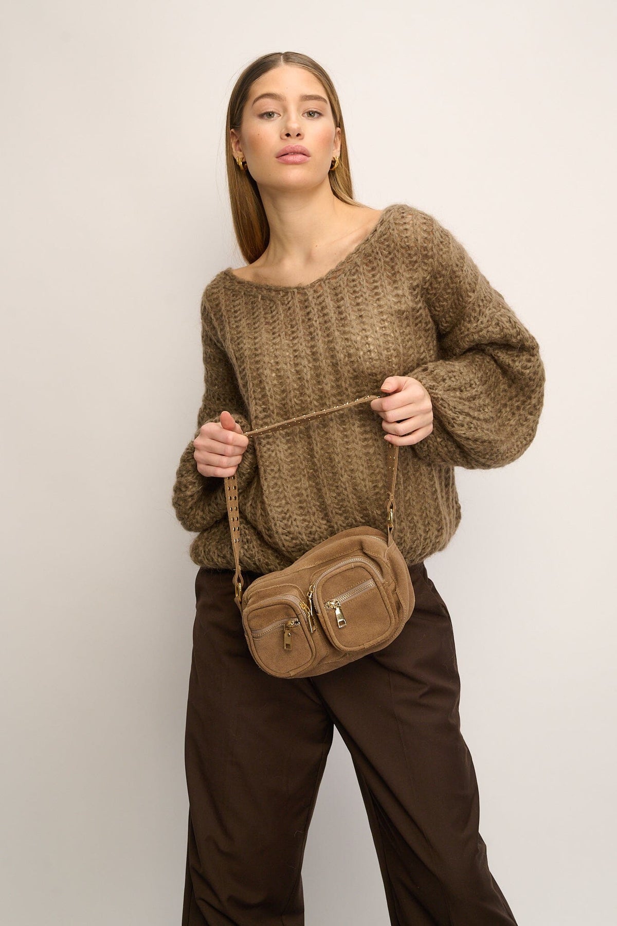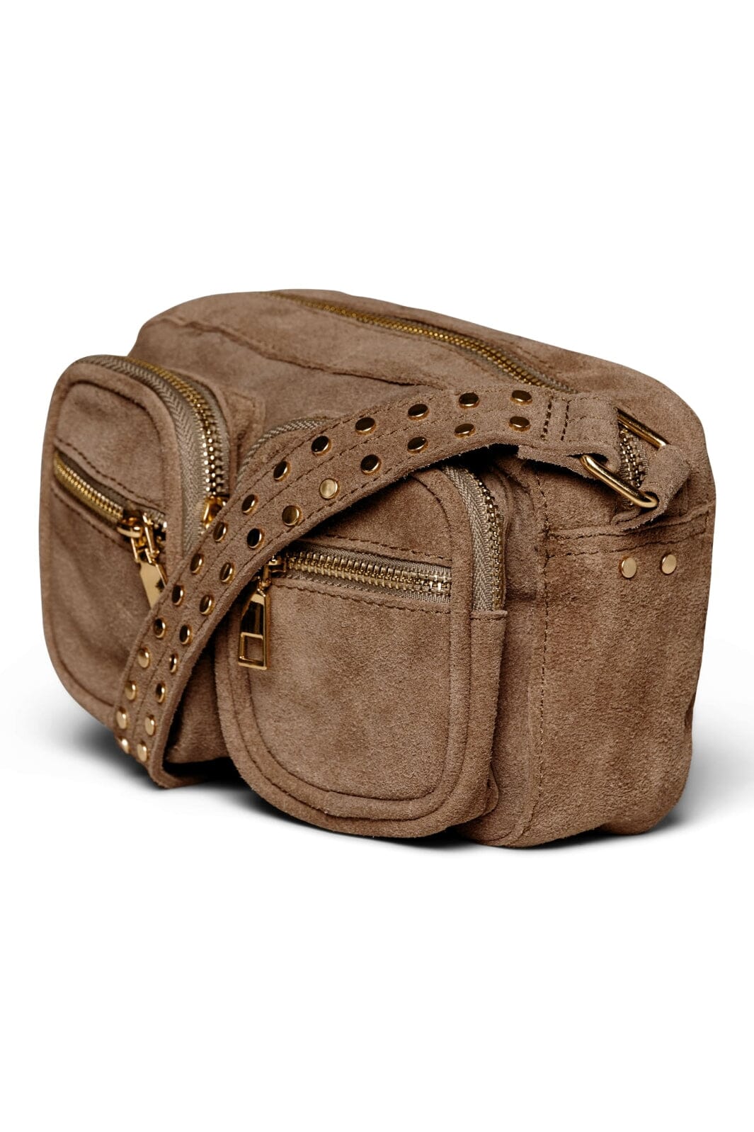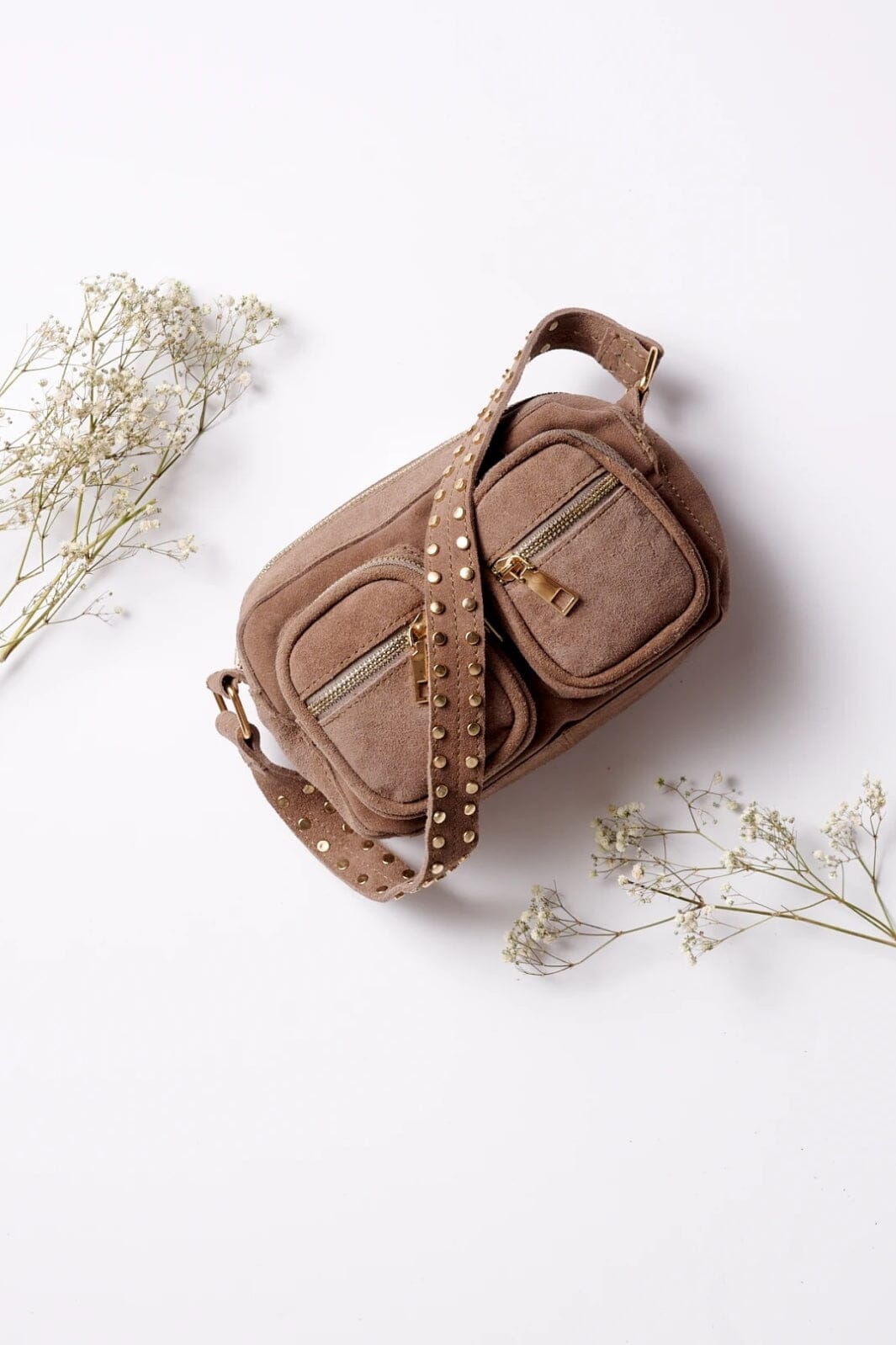 Taupe Schultertasche aus echtem Wildleder von Noella. Die Tasche hat zwei Fronttaschen mit Reißverschlüssen und einen verstellbaren Riemen mit goldenen Nieten, der einen eleganten Look verleiht.