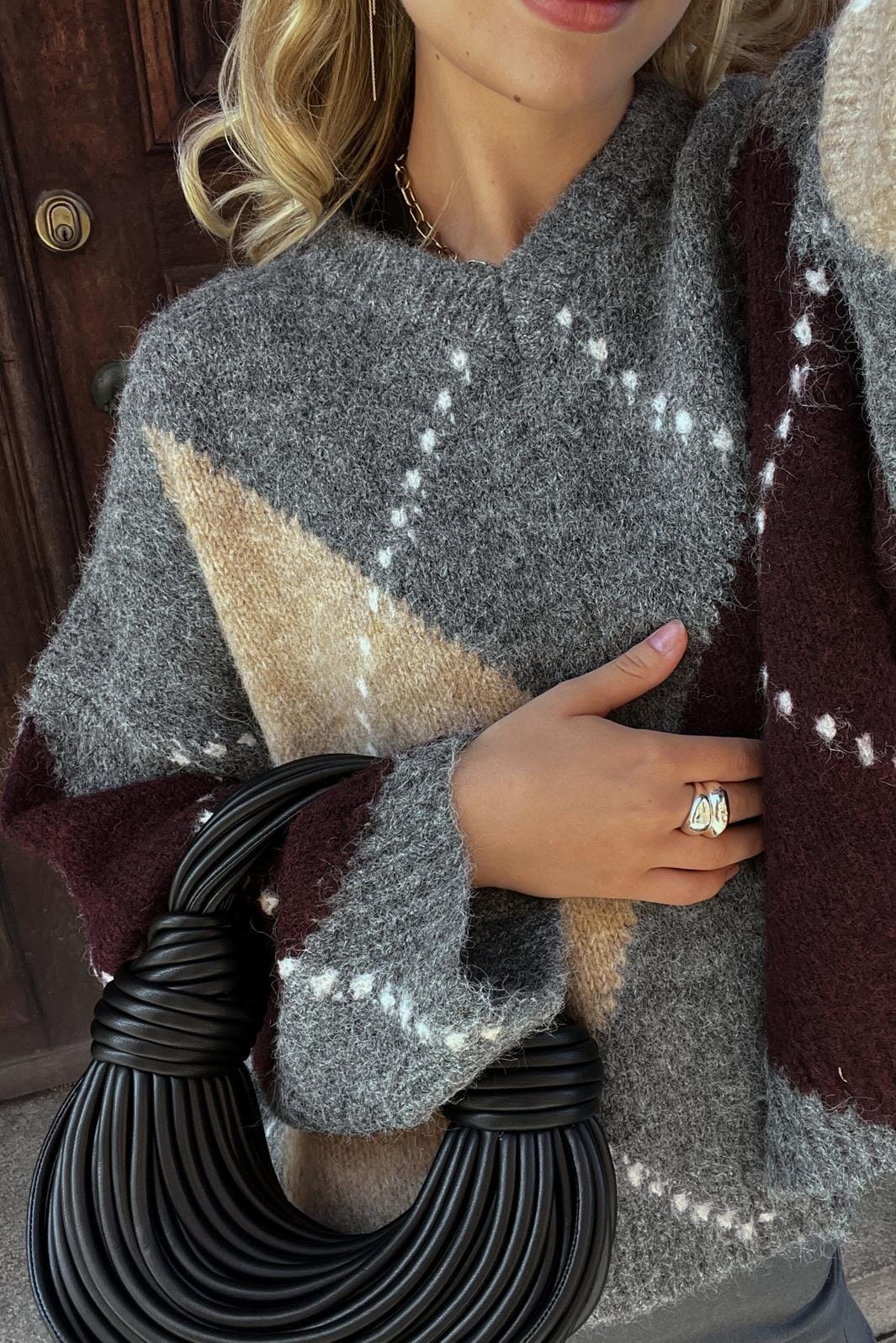 Ein grauer Strickpullover von Noella mit oversized Design und langen Ärmeln. Der Pullover hat ein Argyle-Muster in Grau, Beige und Bordeaux.