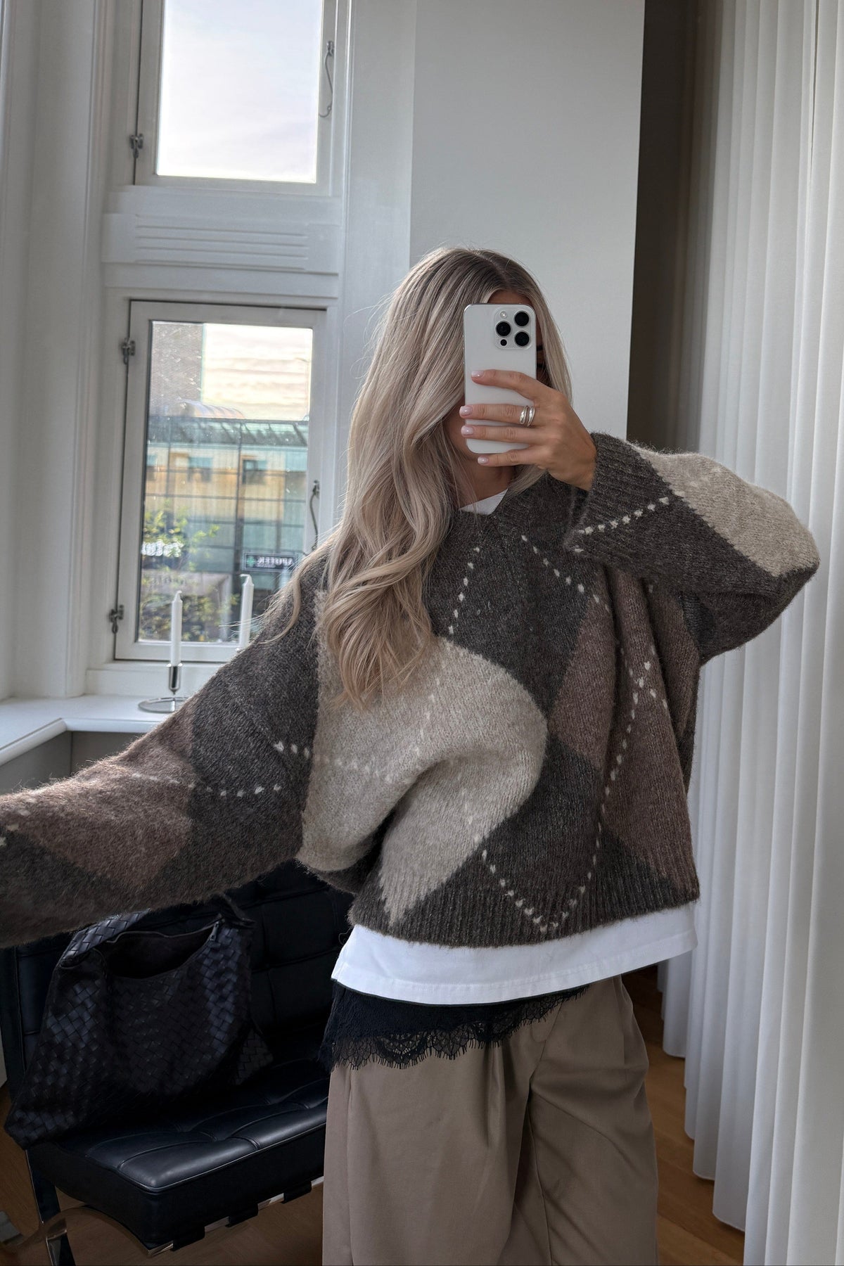 Strickpullover von Noella in einer Mischung aus braunen und hellbeigen Nuancen. Der Pullover hat ein klassisches Argyle-Muster mit dekorativen Nähten.