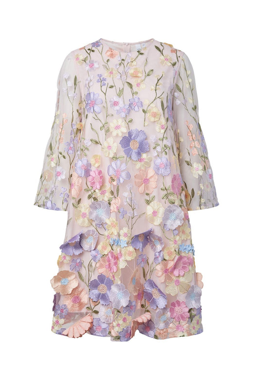 Dunkelblaues Kleid von Noella mit gestickten Blumen und gerafften Details entlang der Seiten. Das Kleid reicht bis zu den Waden und hat einen hohen Ausschnitt ohne Ärmel.