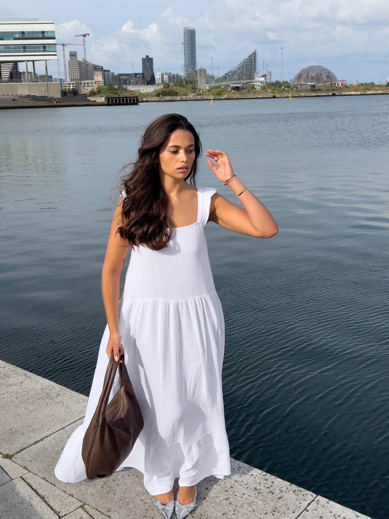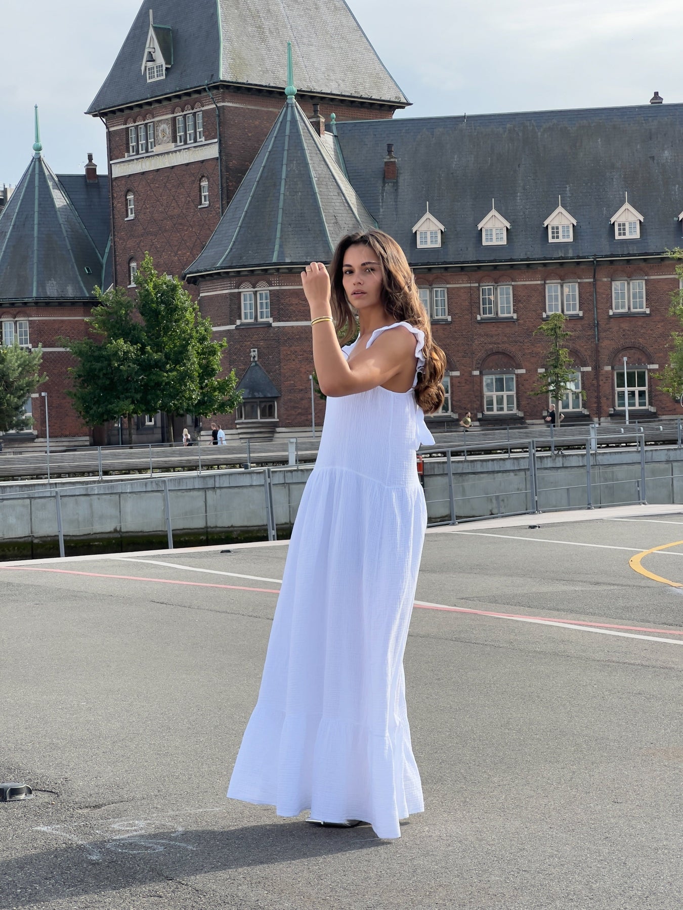 Weißes Kleid von Noella mit Rüschen an den Trägern und Bindeband im Rücken. Das lange Kleid hat eine lockere Passform und ist aus leichtem Baumwollstoff mit quadrischem Ausschnitt gefertigt.