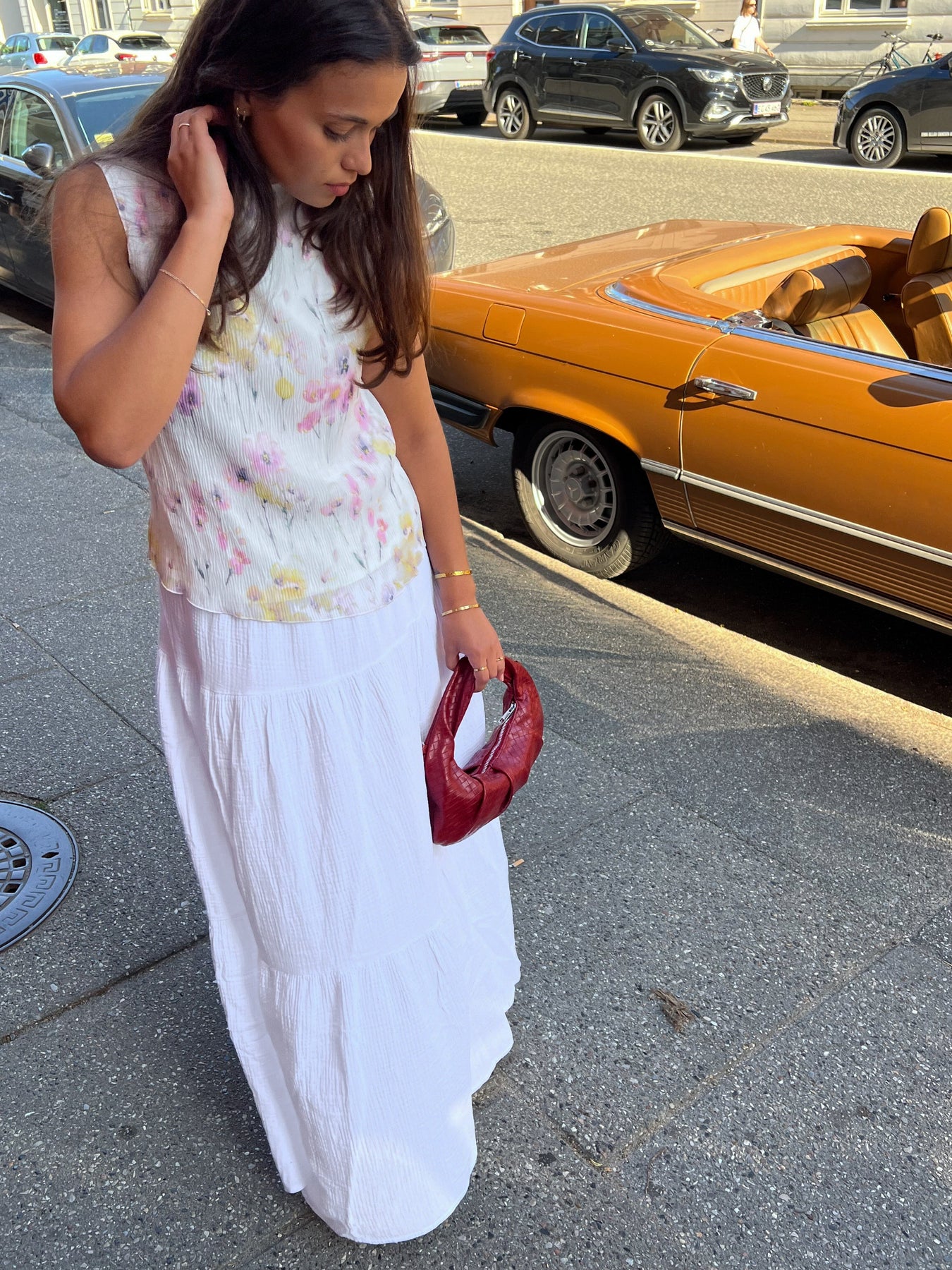 Ärmelloses Top von Noella mit Blumenmuster in Weiß und Pastellfarben. Das Top hat einen runden Ausschnitt und ist mit einem Salatkant verziert, der Bewegung in den Stoff bringt.