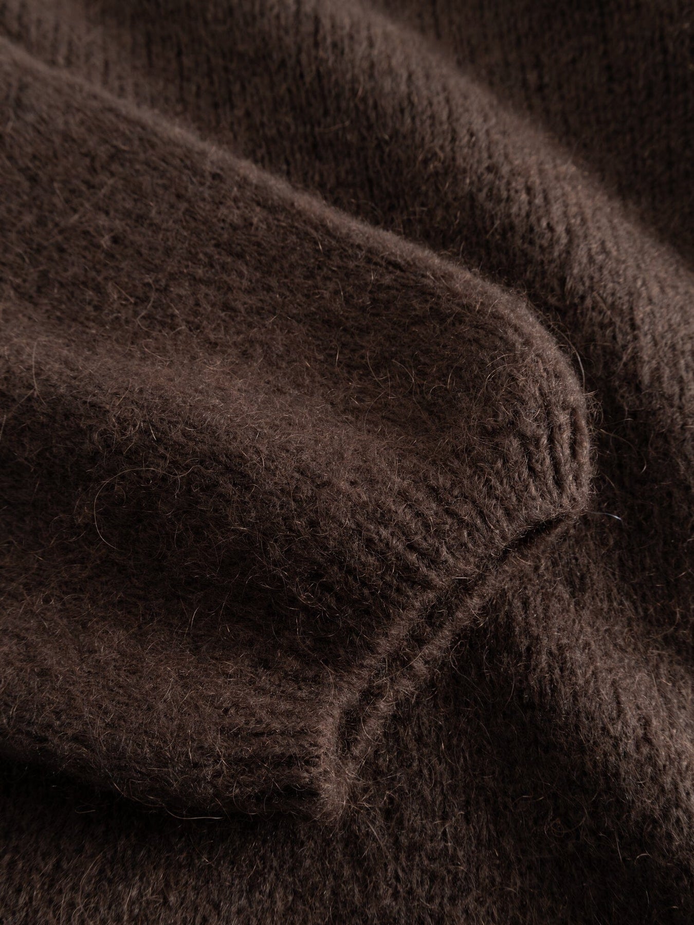Dunkelbrauner Strickpullover mit Puffärmeln und Cropped-Design. Das weiche Strickmaterial hat einen runden Halsausschnitt und eine lockere Passform, die viel Bewegungsfreiheit bietet.