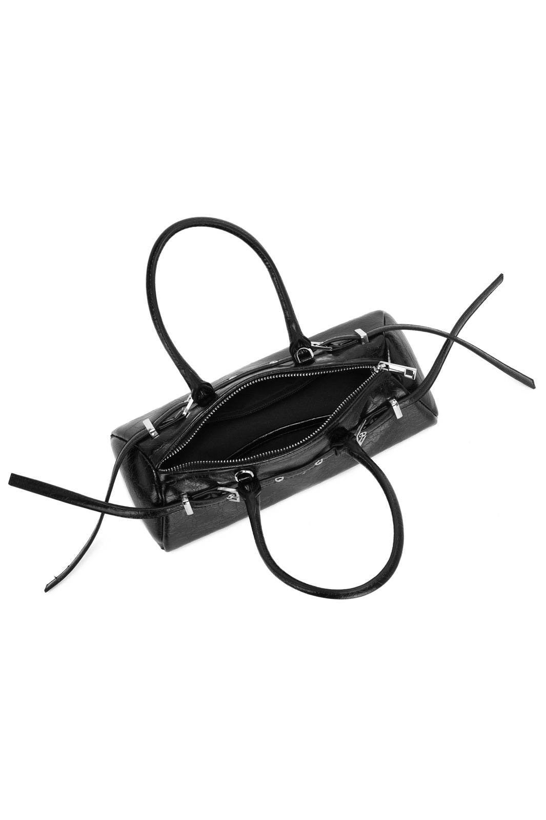 Schwarze Tasche von Noella mit Lederoptik und Patina. Die Tasche hat zwei kurze Henkel und einen abnehmbaren Schulterriemen.