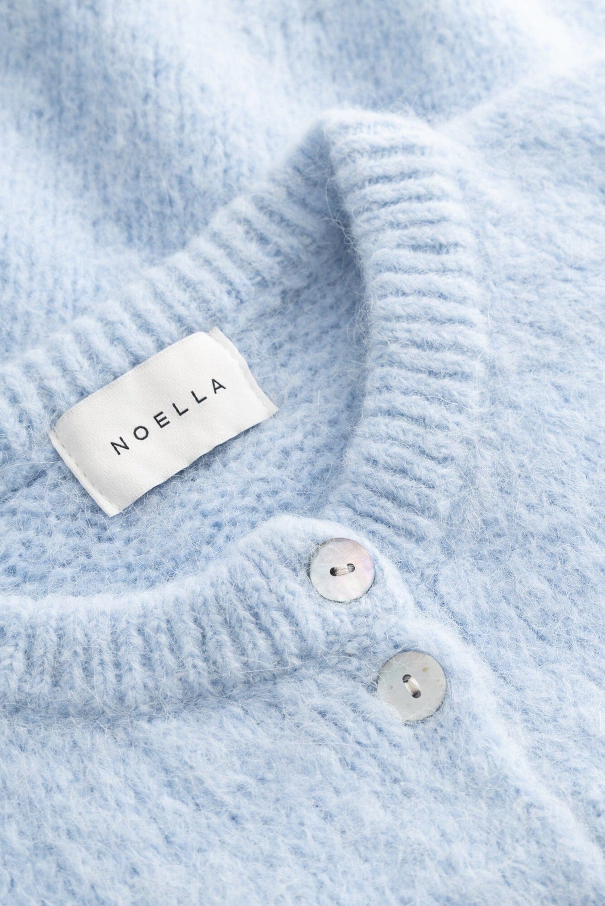 Hellblaue Strickcardigan von Noella mit Knöpfen entlang der Vorderseite. Die Cardigan hat Rippstrick an Bündchen und Saum sowie einen runden Halsausschnitt.