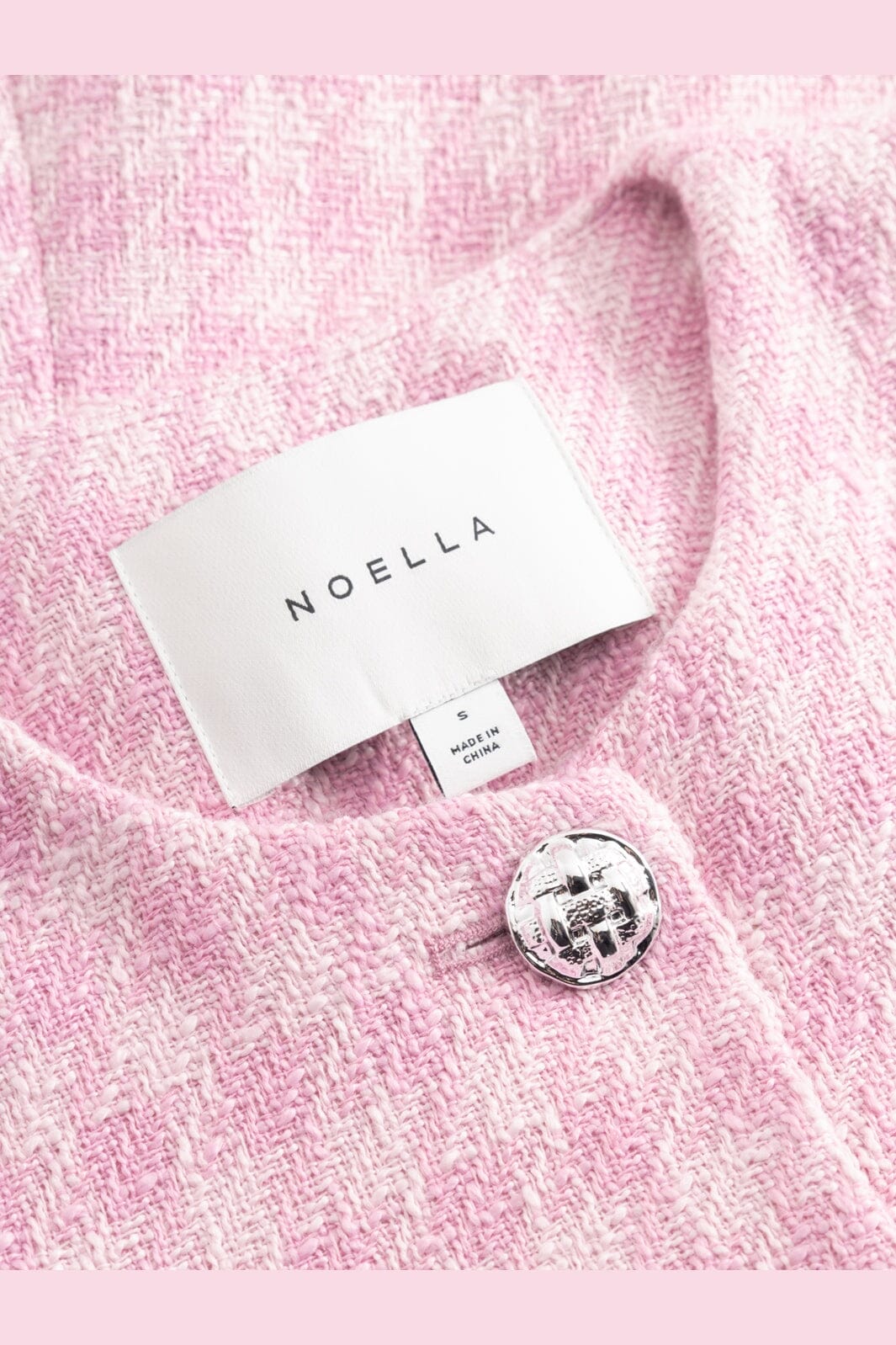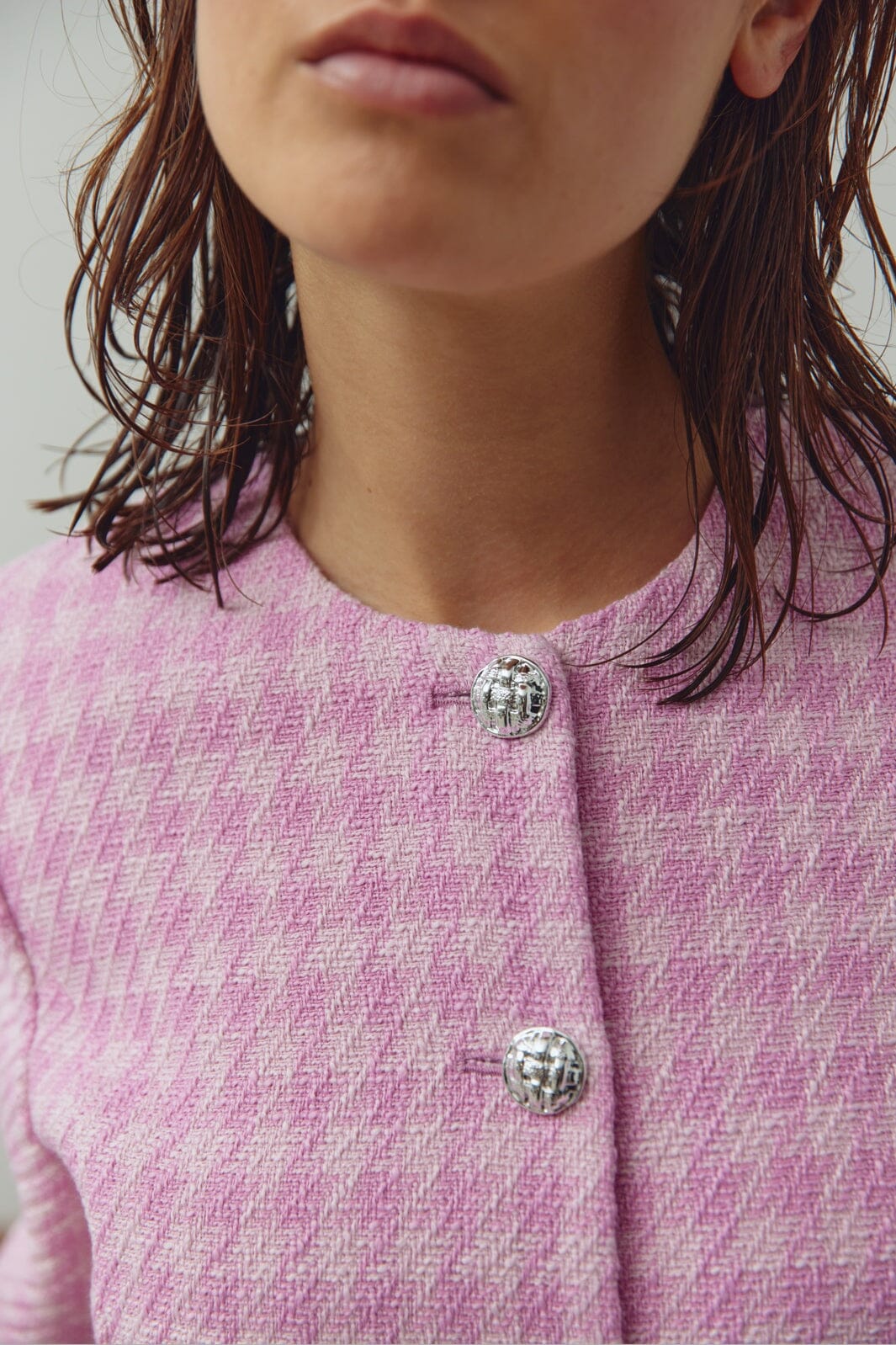 Rosa karierter Blazer von Noella, gefertigt aus gewebtem Polyester. Der Blazer hat eine taillierte Passform und kurze Ärmel mit rundem Halsausschnitt.