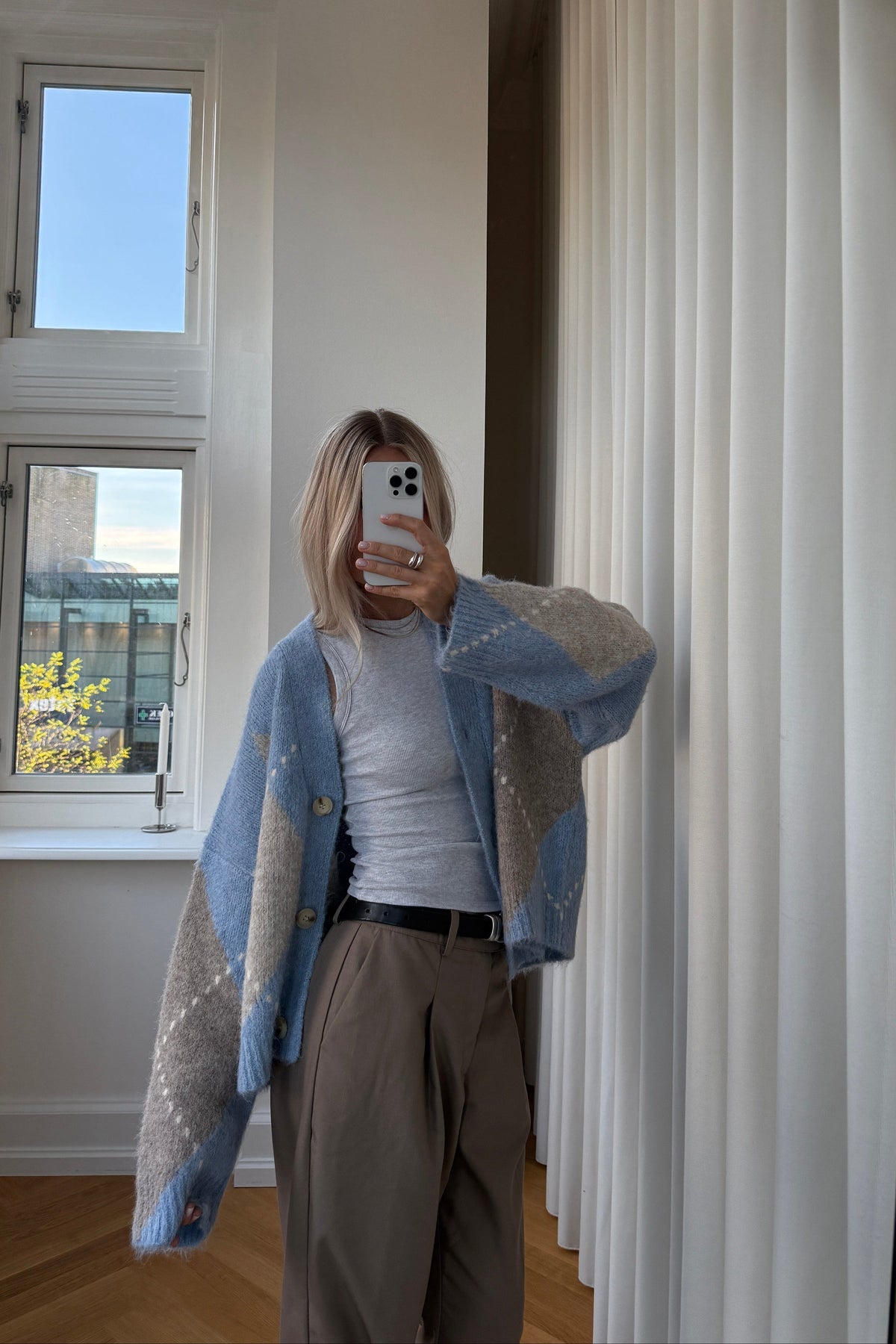 Gestrickte Strickjacke von Noella mit klassischem Argyle-Muster in hellblauen und beigen Nuancen. Die Strickjacke hat einen V-Ausschnitt und drei Knöpfe vorne.