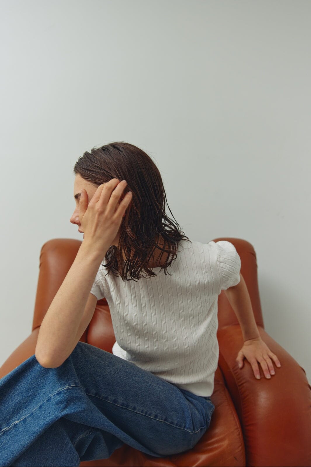 Zopfmuster-Pullover von Noella in einem Off-White-Ton. Der Pullover hat kurze Ärmel und einen runden Halsausschnitt.