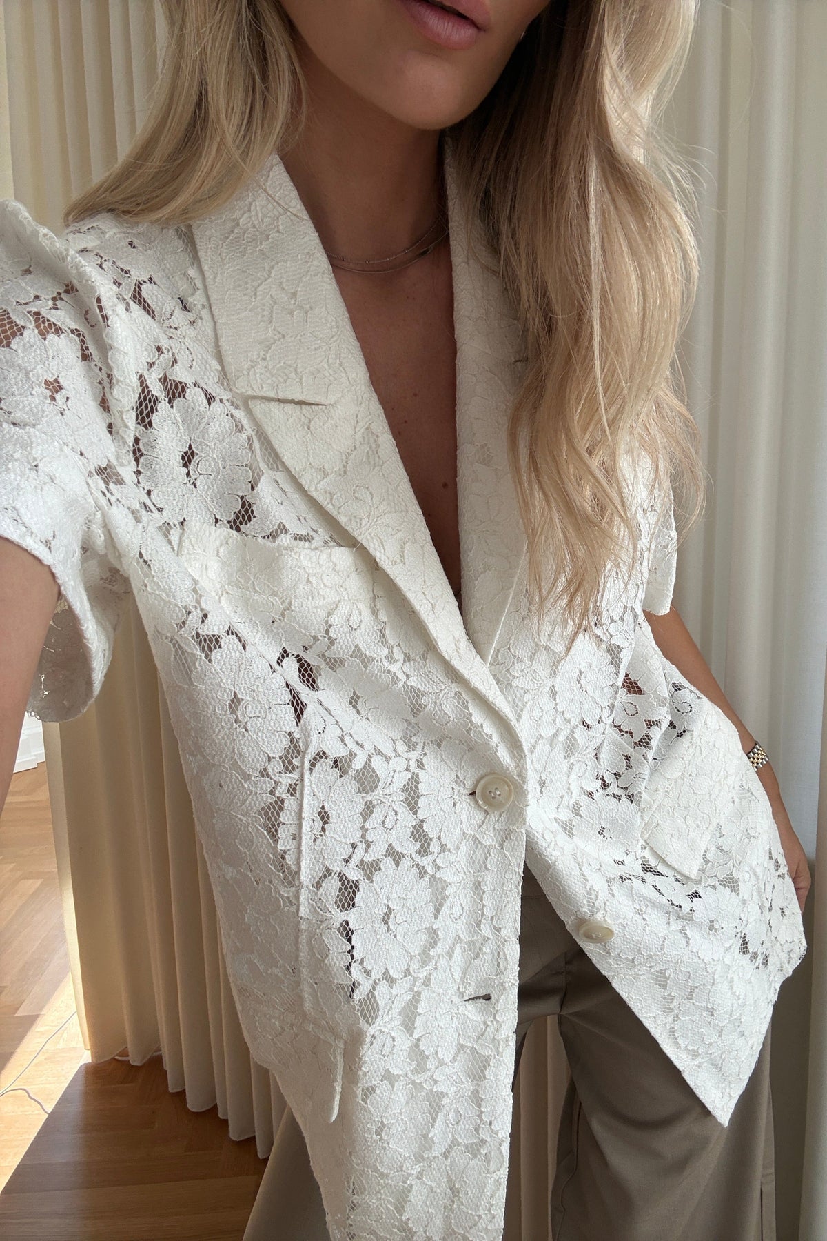 Blazer von Noella in Off-White, gefertigt ausschließlich aus Spitze. Der Blazer hat eine oversized Passform mit kurzen Ärmeln und einem klassischen Kragen.