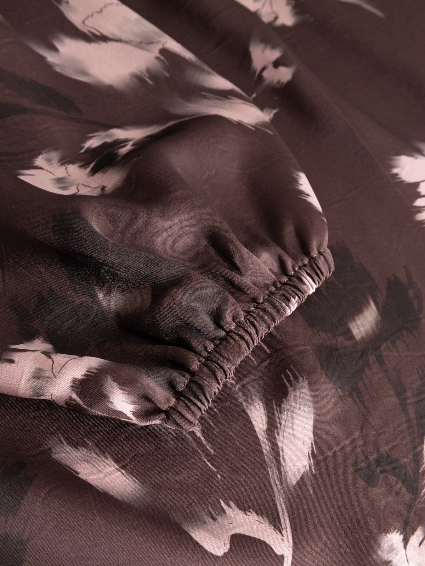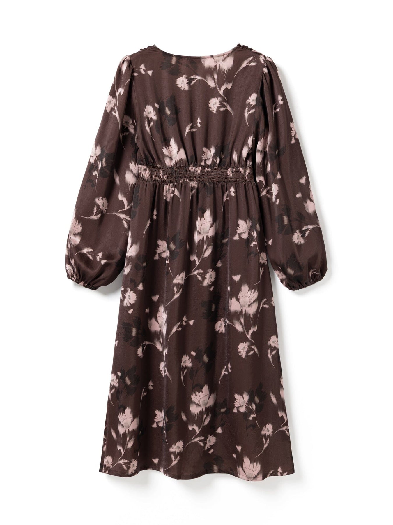 Kleid von Noella in Burgundertönen mit einem Blumenmuster in roten und braunen Nuancen. Das Kleid hat lange Ärmel, einen V-Ausschnitt mit Knopfdetails und ein betontes Taillenstück.