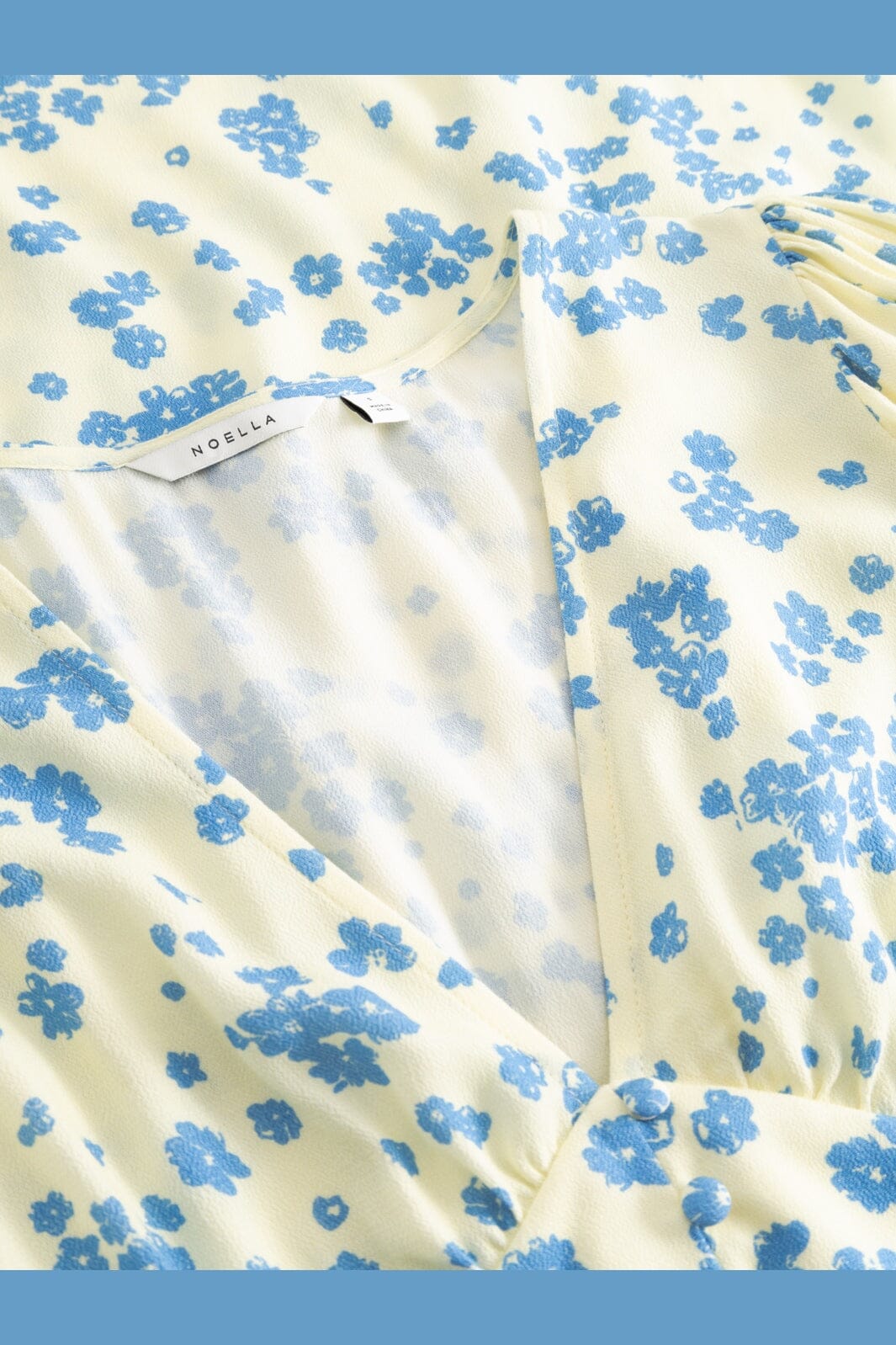Kleid von Noella in Gelb mit blauem Blumenmuster. Das Kleid hat einen tiefen V-Ausschnitt und kurze Ballonärmel mit Volumen.