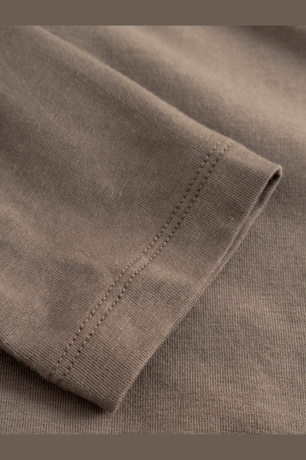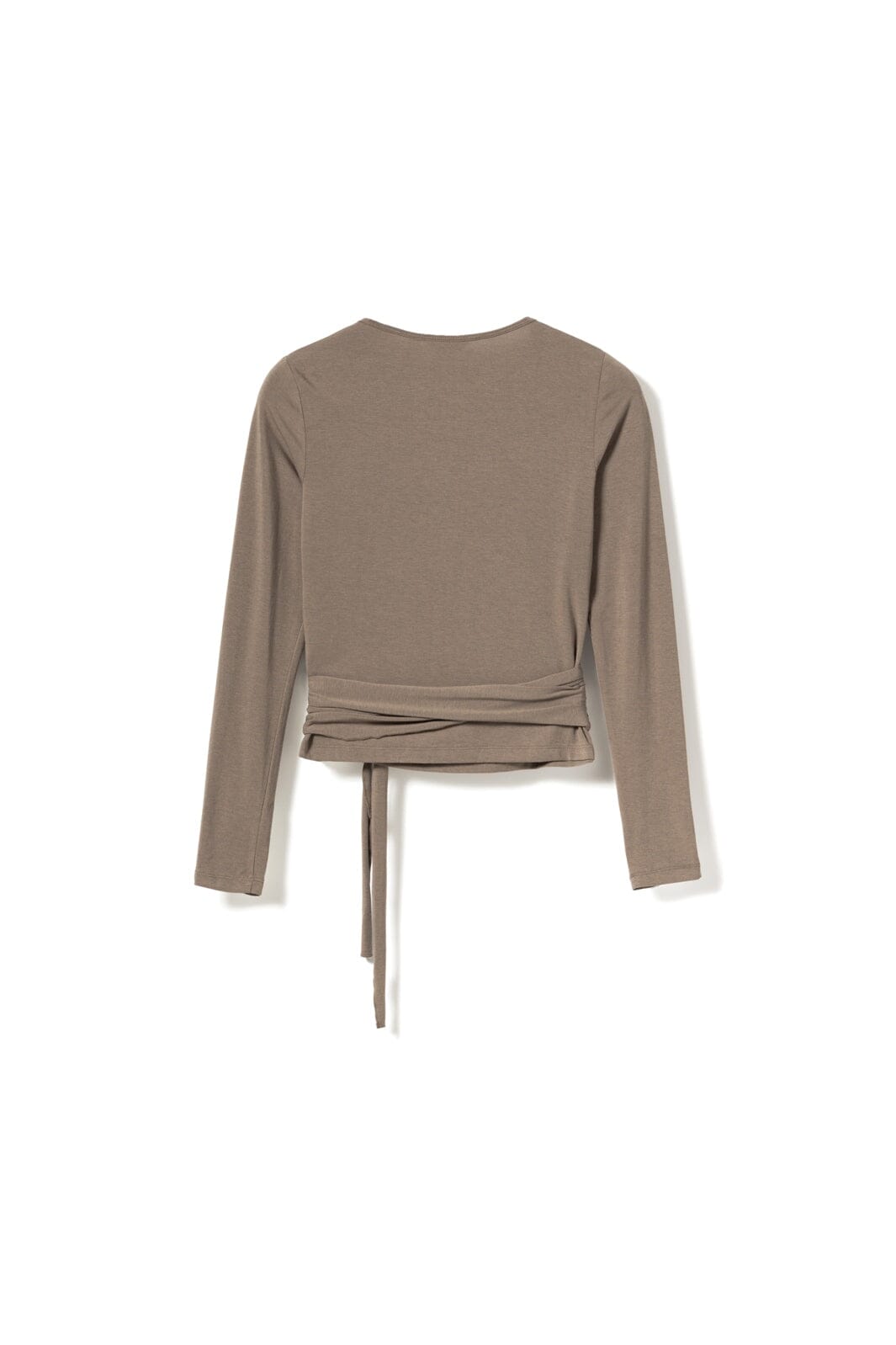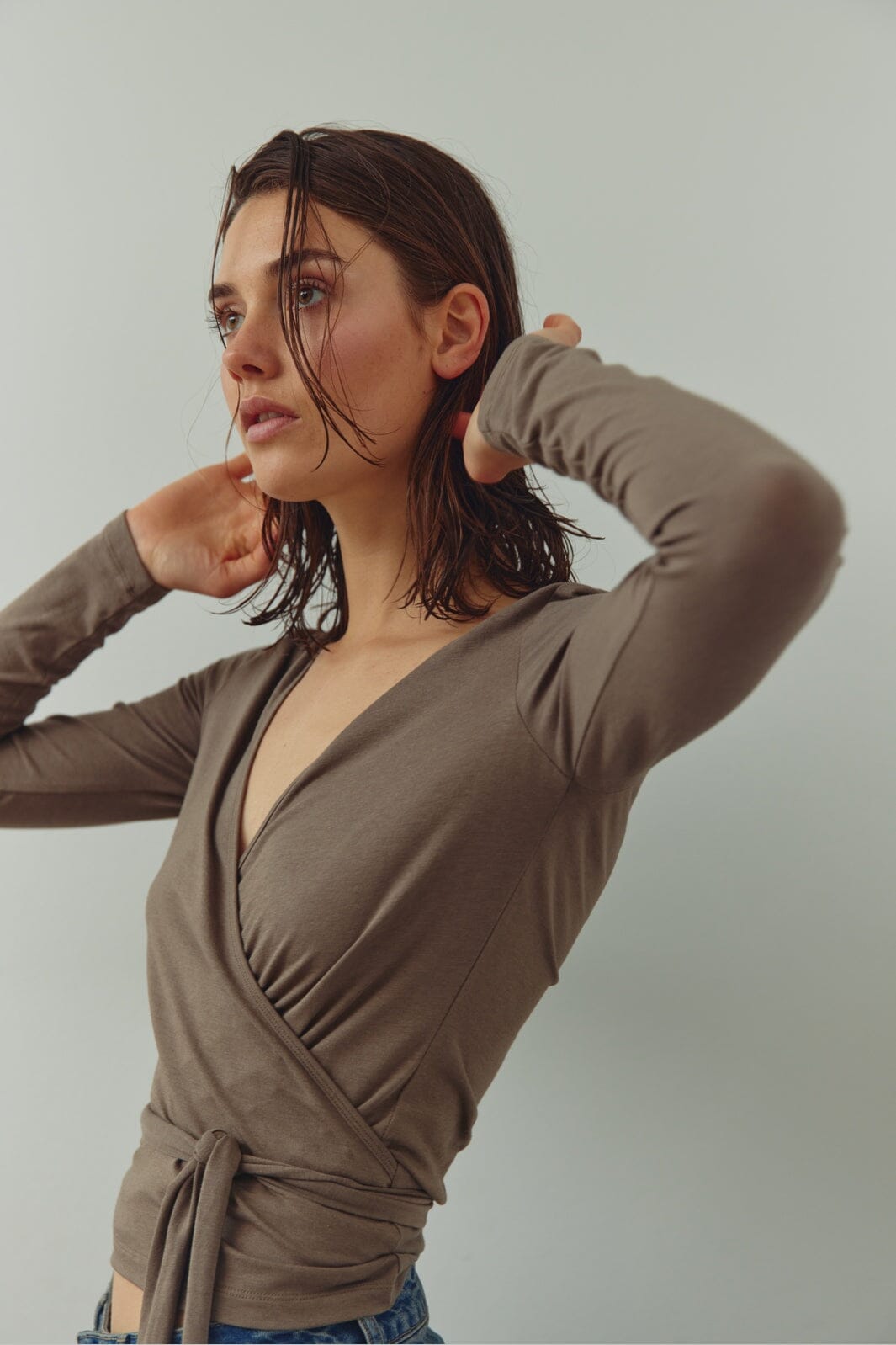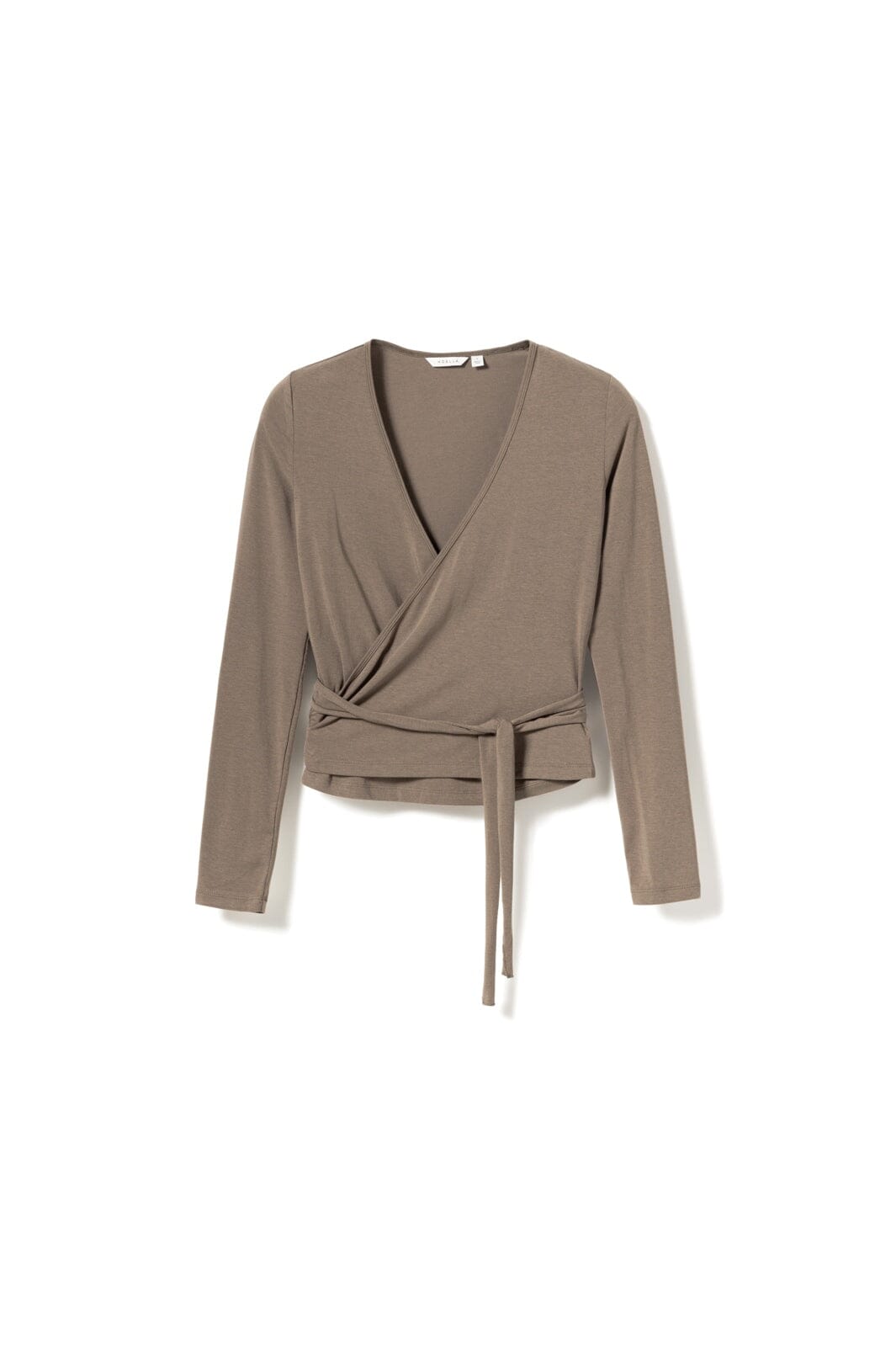 Top von Noella mit Wickeldesign in einem graubraunen Farbton. Das Top hat lange Ärmel und ein Bindeband in der Taille.