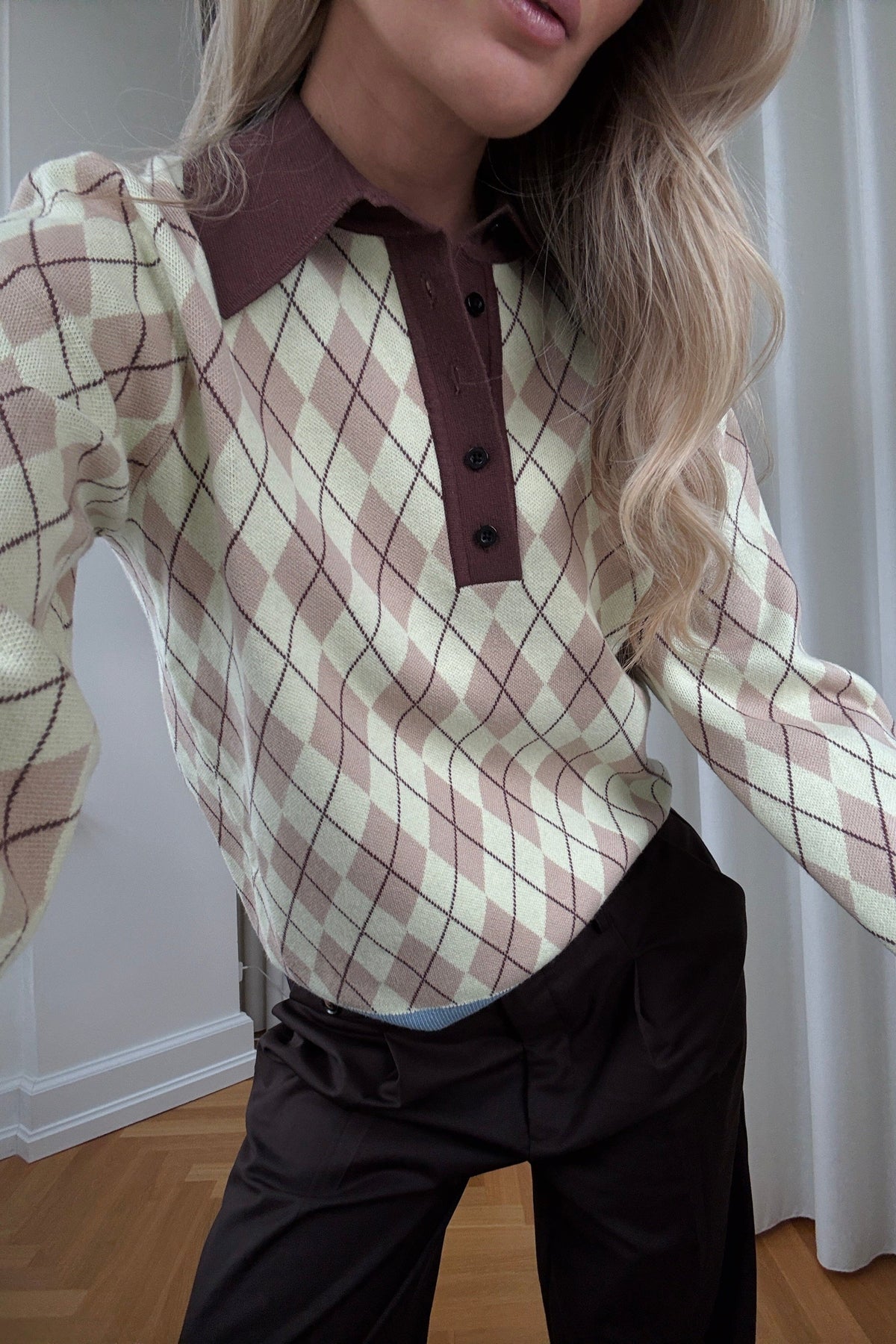 Strickpullover von Noella aus gelb-braun kariertem Intarsienstrick. Der Pullover hat einen braunen Polokragen, lange Ärmel mit hellblauen Bündchen und eine Slim-Fit-Passform.
