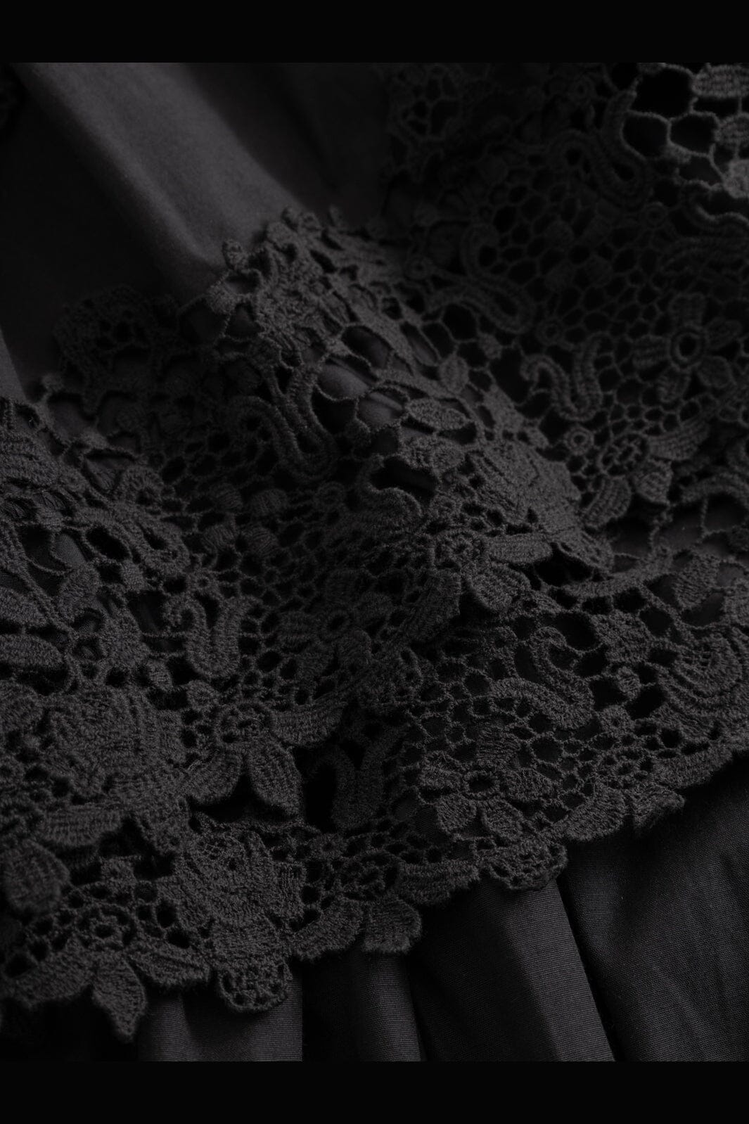 Schwarzes Kleid von Noella mit Stickereien, Spitze und Rüschen. Das Kleid hat einen hohen Kragen, 3/4-lange Ärmel und einen knöchellangen Rock.