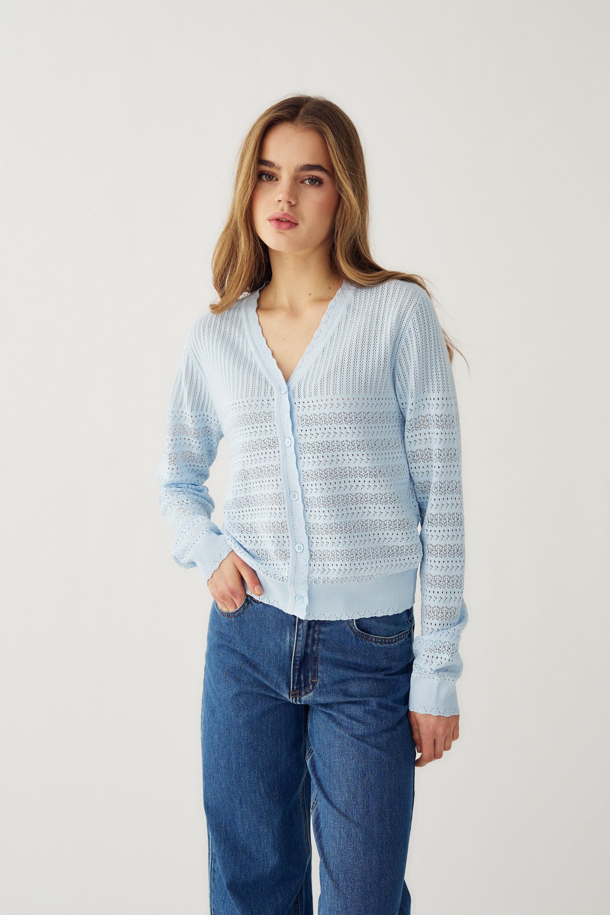Hellblaue Strickcardigan von Noella aus 100 % Viskose. Die Cardigan hat lange Ärmel, einen V-Ausschnitt und eine Knopfleiste vorn. Das Strickmuster kombiniert horizontale Streifen mit Lochmuster.