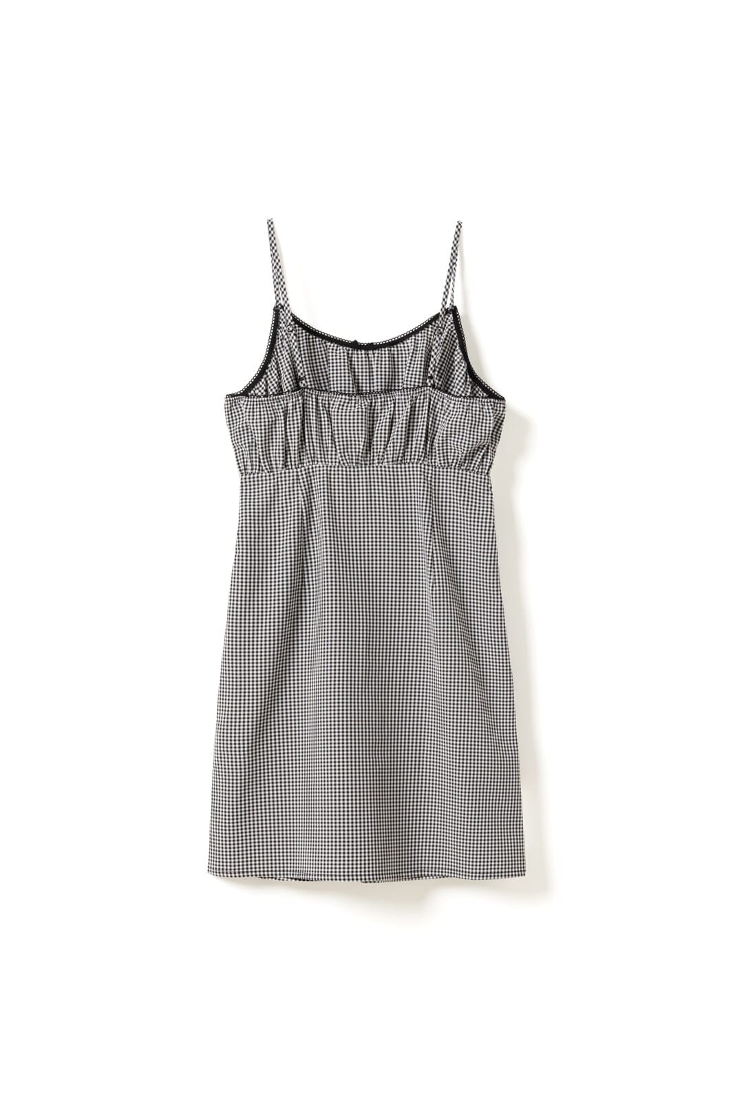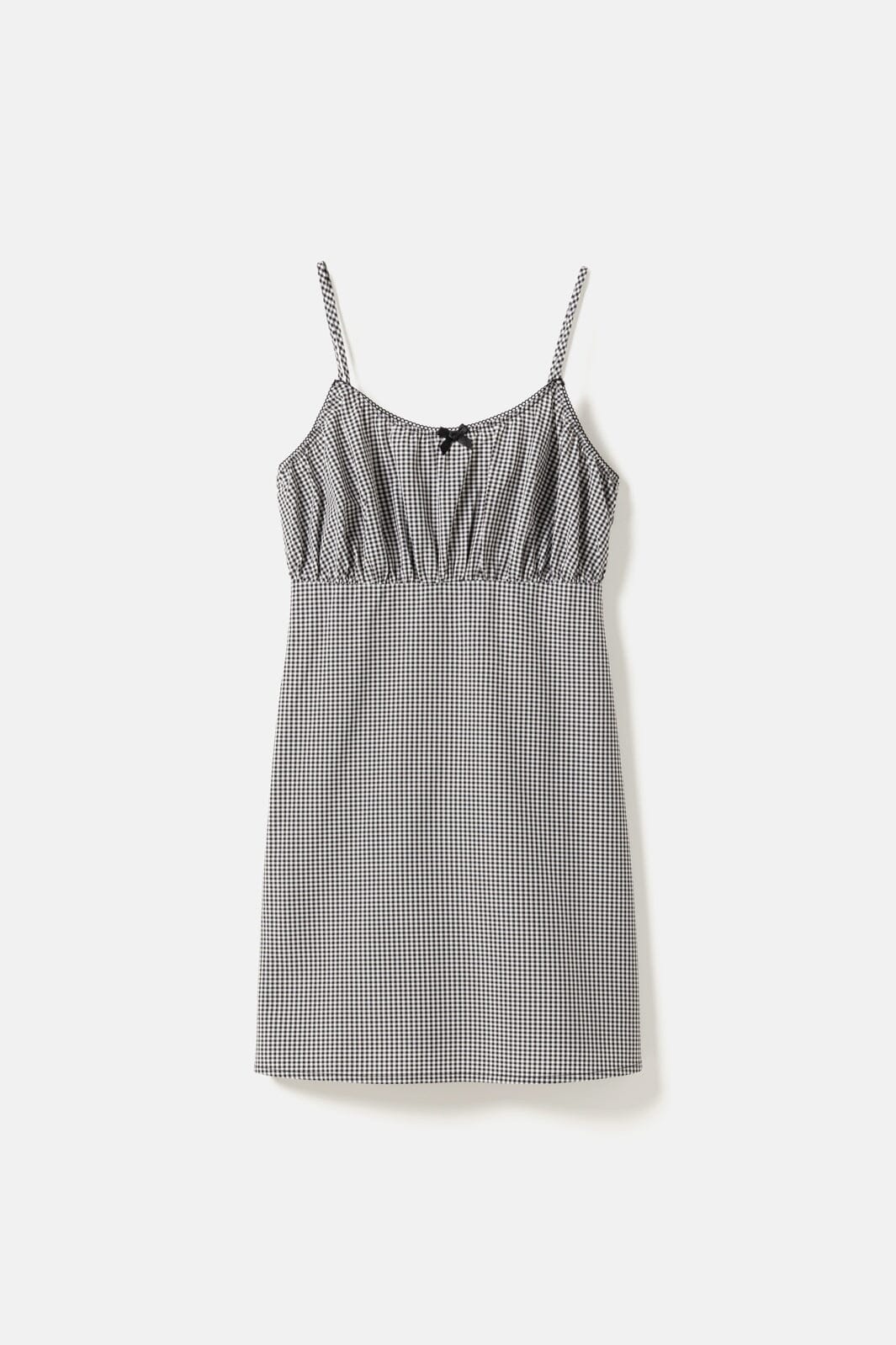 Kariertes Kleid von Noella mit schwarz-weißem Muster. Das Kleid hat dünne Träger und eine Schleife vorne in der Mitte. Es ist unter der Brust mit Raffungen oben geschnitten.