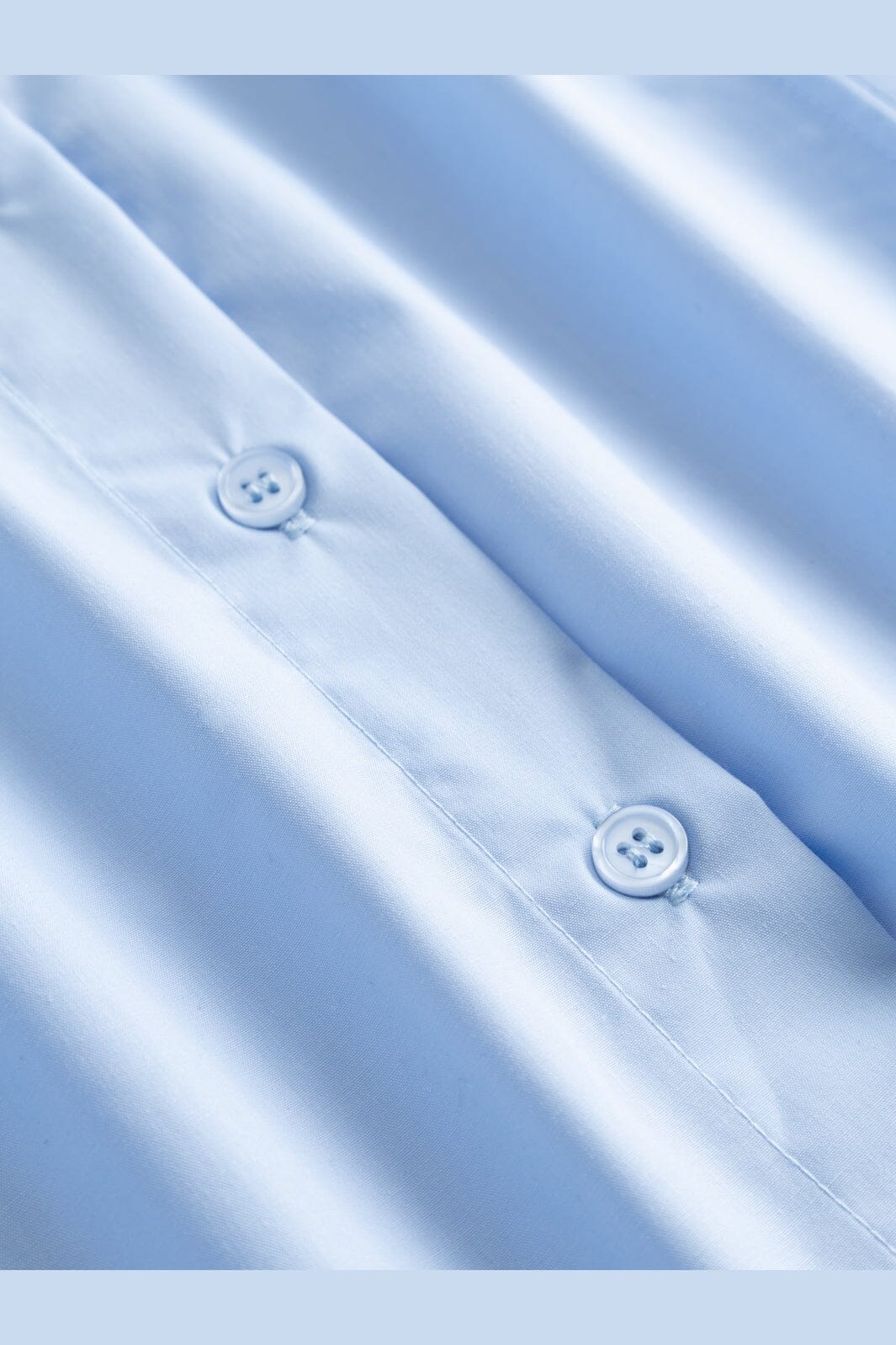 Hellblaue Bluse von Noella, gefertigt aus 80 % Polyester und 20 % Baumwolle. Die Bluse hat einen hohen Halsausschnitt und Pintuck-Details an der Brust.