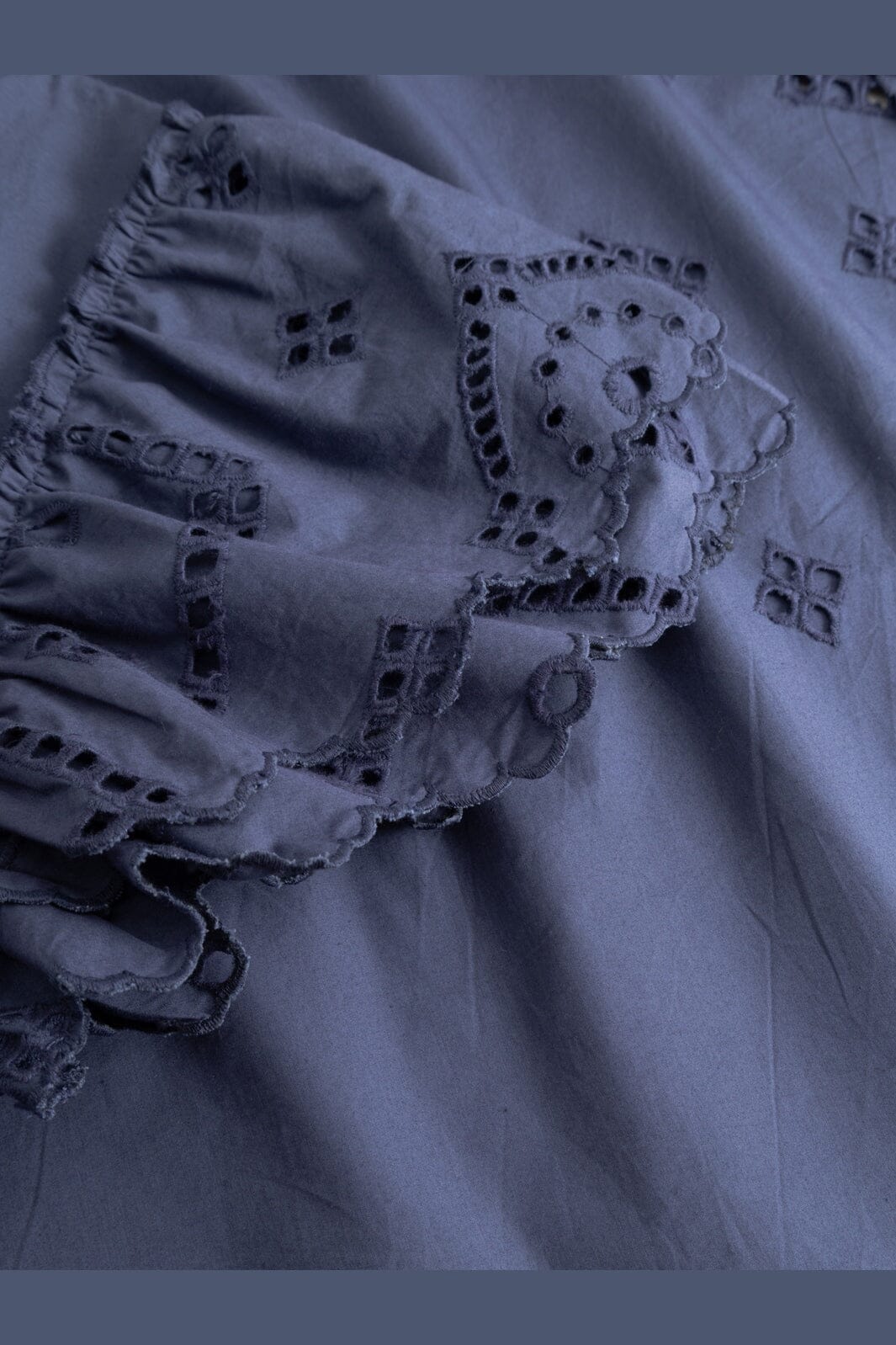 Kleid von Noella in Staubblau. Hergestellt aus 100 % Baumwolle mit Stickereidetails, Bindeband und Spitze.