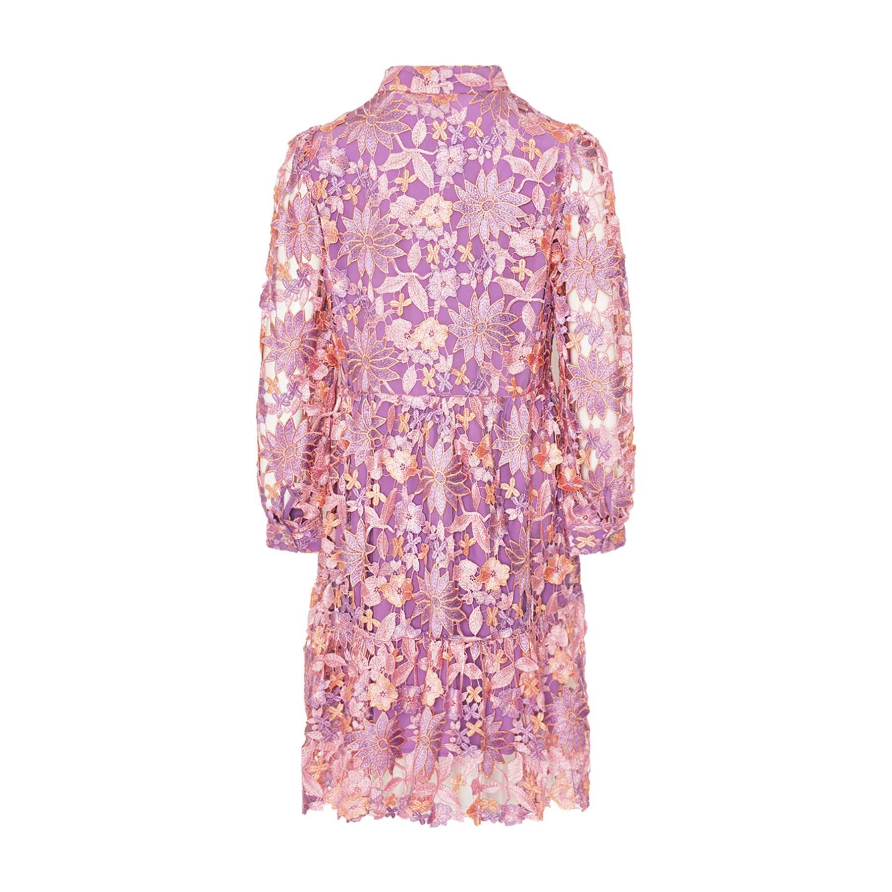 Spitzenkleid von Noella in lila Mix mit orange und pinkem Blumenmuster. Das Kleid besteht aus schwerer Spitze mit Rüschendetails und hat einen Hemdkragen sowie lange Ärmel.