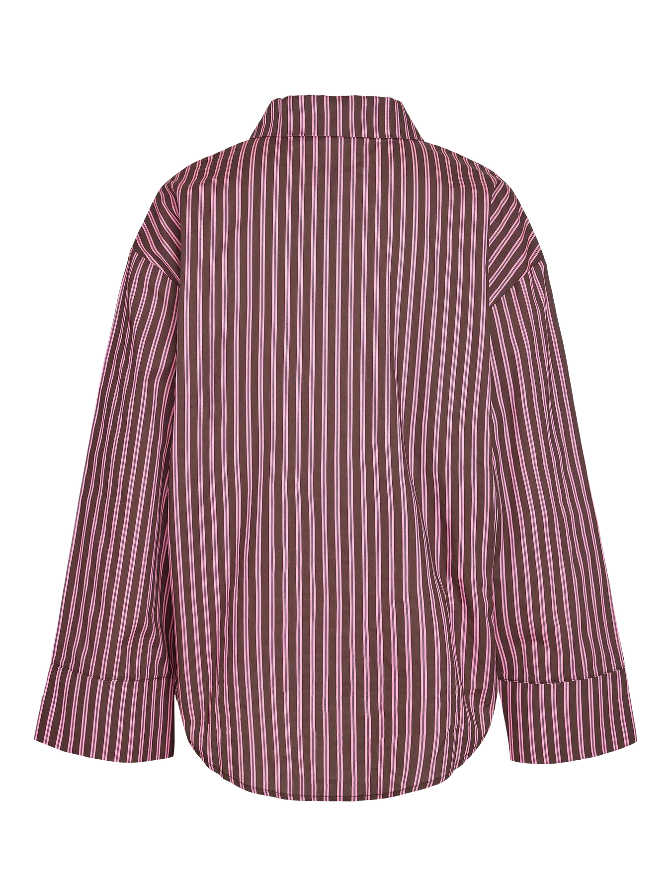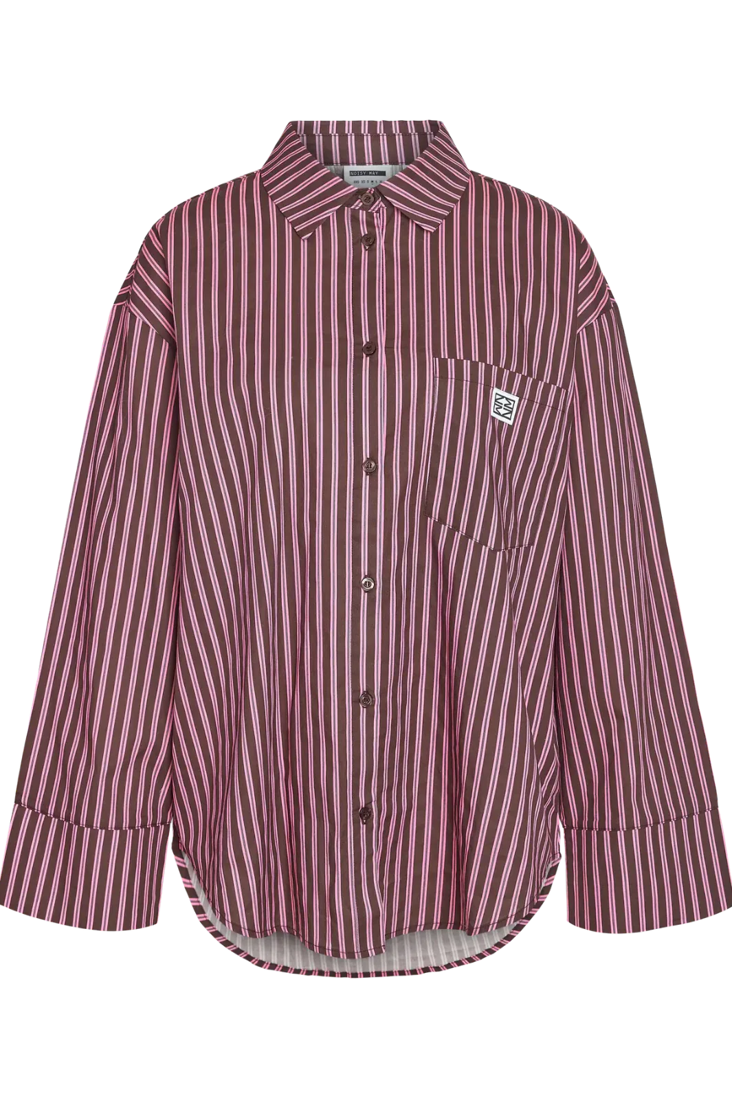 Gestreiftes Hemd von Noisy May mit einem Muster in Bordeaux, Rosa und Weiß. Das Hemd hat einen klassischen Kragen, eine Brusttasche und eine Knopfleiste vorne.