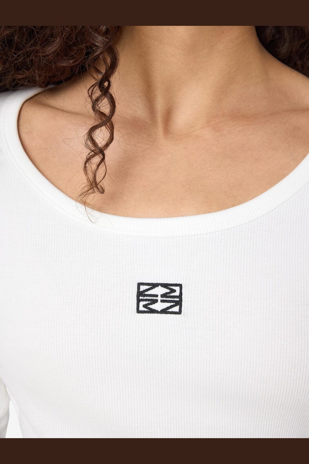 Weißes langärmeliges Top von Noisy May mit Stickerei auf der Vorderseite. Das Top hat einen runden Halsausschnitt und eine eng anliegende Passform, die der Körperform folgt.