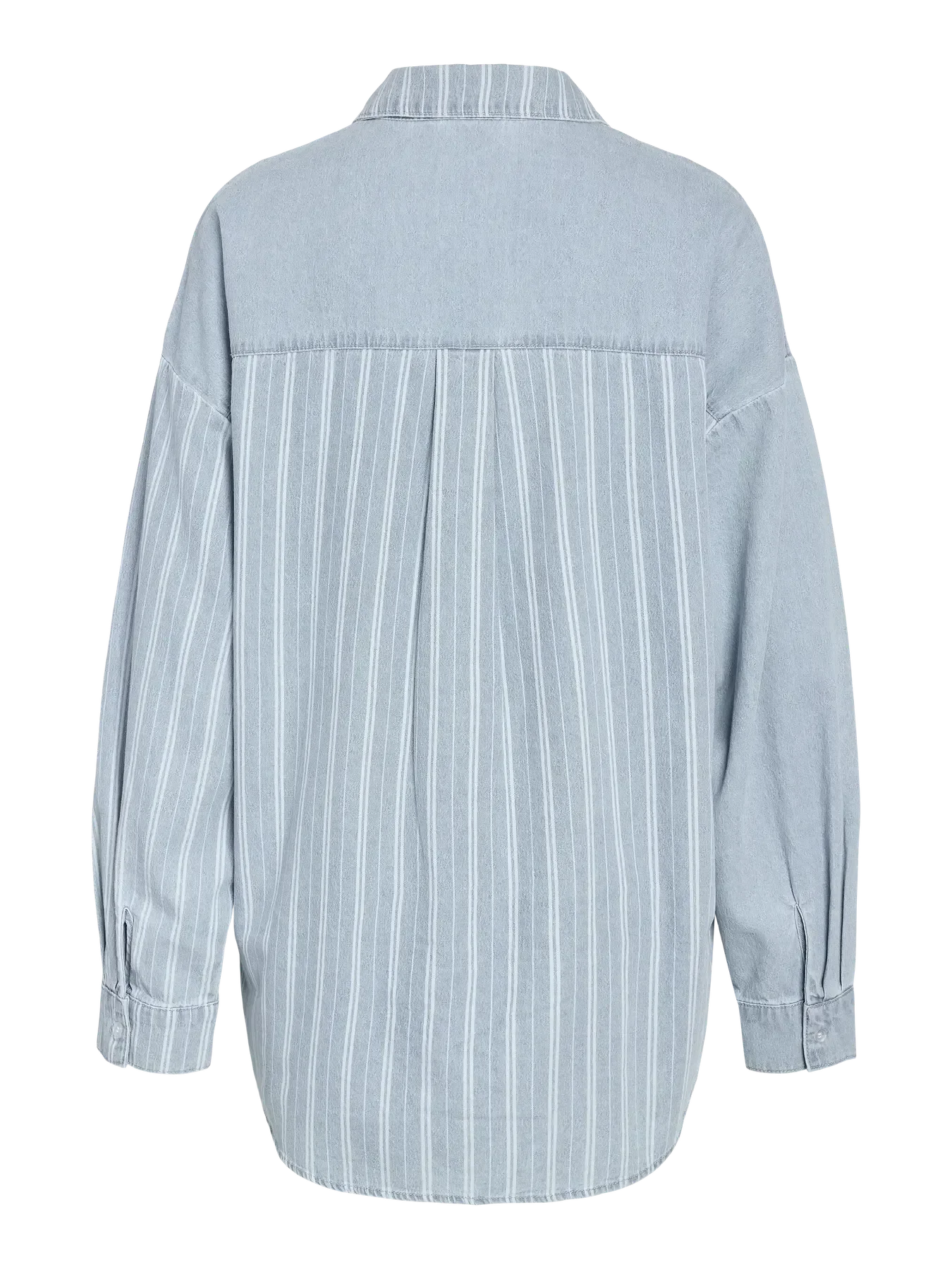 Mittelblaue Denimbluse von Noisy May mit einer Kombination aus gestreiftem und unifarbenem Design. Die Bluse hat eine oversized Passform und besteht aus 100 % Baumwolle.