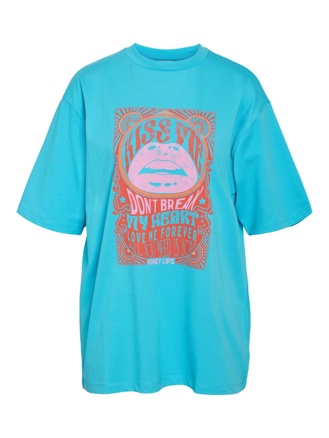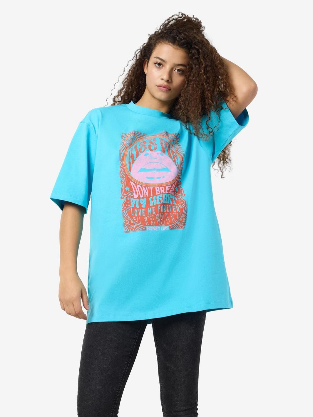T-Shirt von Noisy May in Türkis mit einem retro-inspirierten grafischen Druck auf der Vorderseite. Sie hat eine lockere, oversized Passform und einen runden Halsausschnitt.