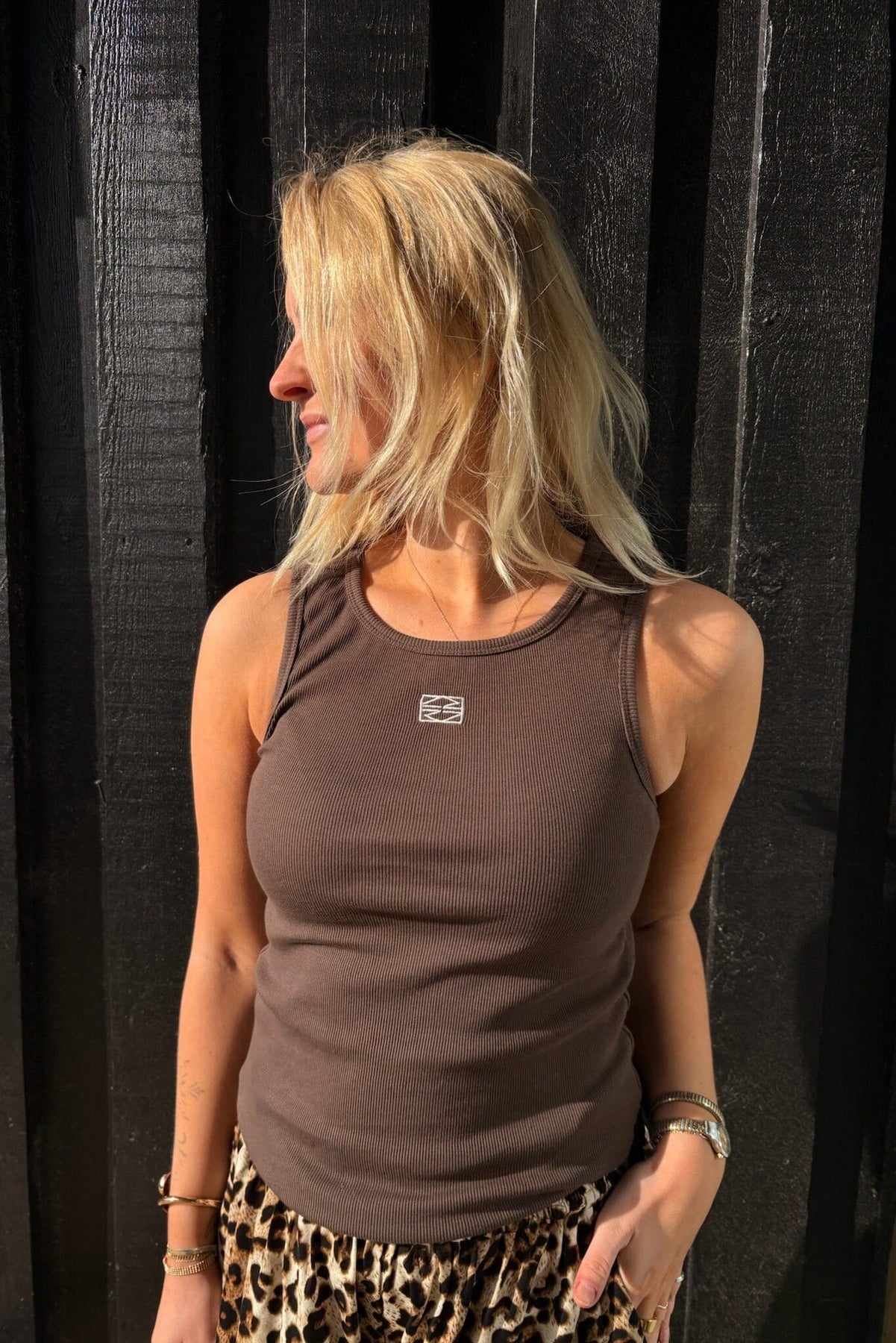 Schokoladenbraunes Tanktop von Noisy May mit rundem Halsausschnitt und ärmellosem Design. Das eng anliegende Modell hat ein kleines gesticktes Logo auf der Vorderseite.
