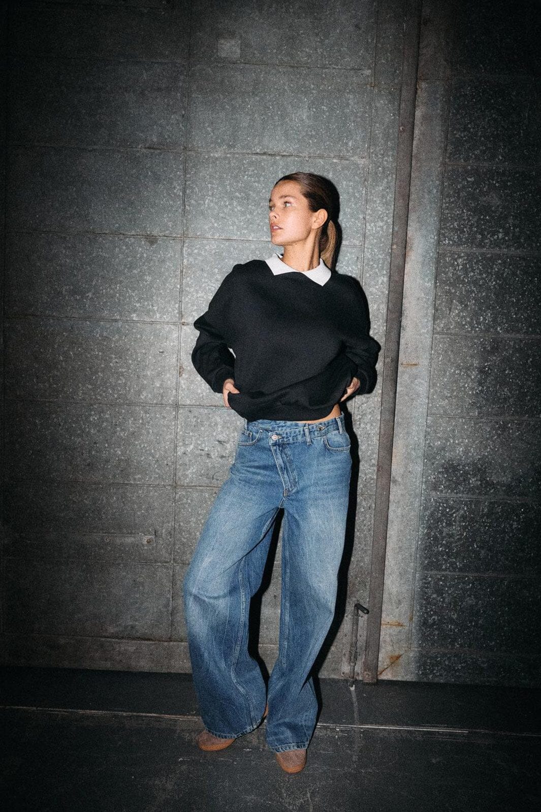 Weite Jeans von Noisy May aus mittelblauem Denim. Die Jeans hat eine lockere Passform und einen klassischen Denim-Look mit überkreuztem Detail am Verschluss vorn.