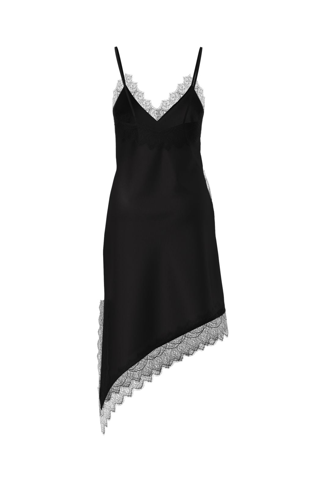 Schwarzes Satinkleid von Noisy May mit Spitzen-Details entlang des V-Ausschnitts und asymmetrischem Saum. Das Kleid hat dünne Spaghetti-Träger und eine glänzende Oberfläche.