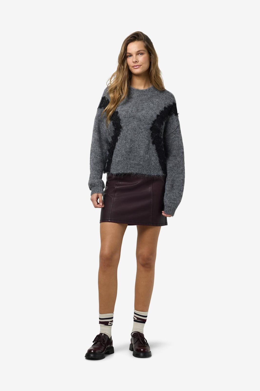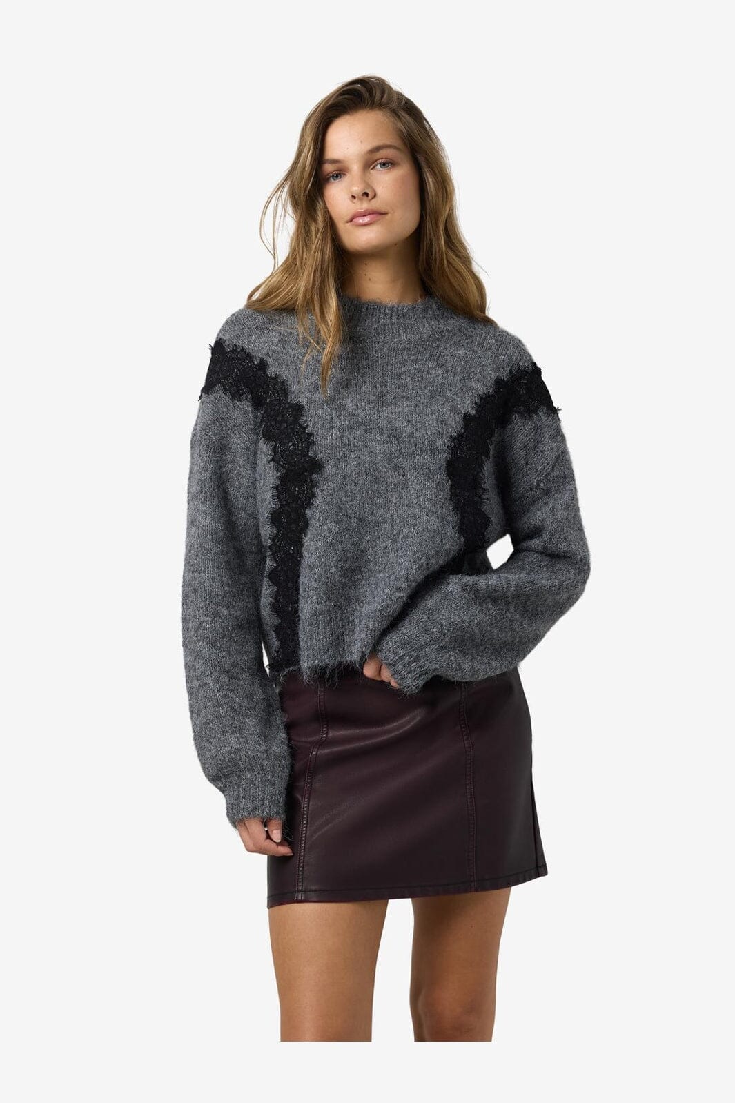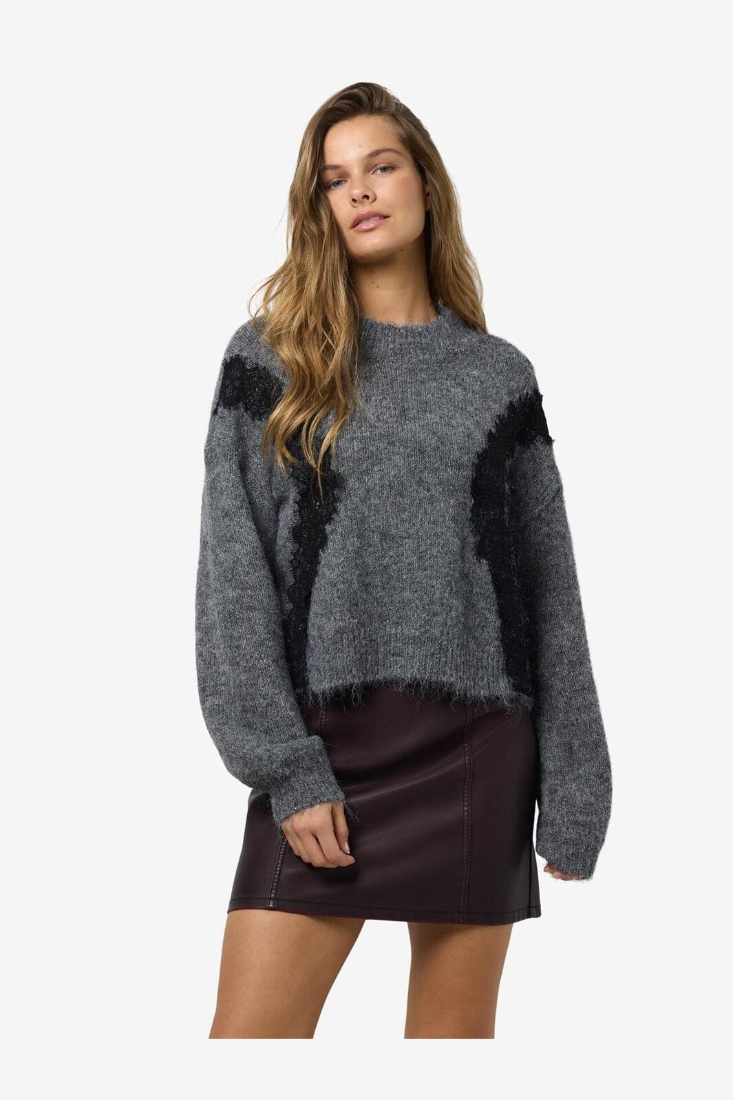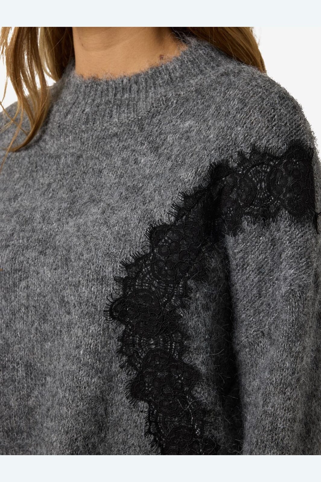 Noisy May Nmsutton L/S O-Neck Lace Knit Fwd Farbe: 4986587 Dark Grey Melange Lace