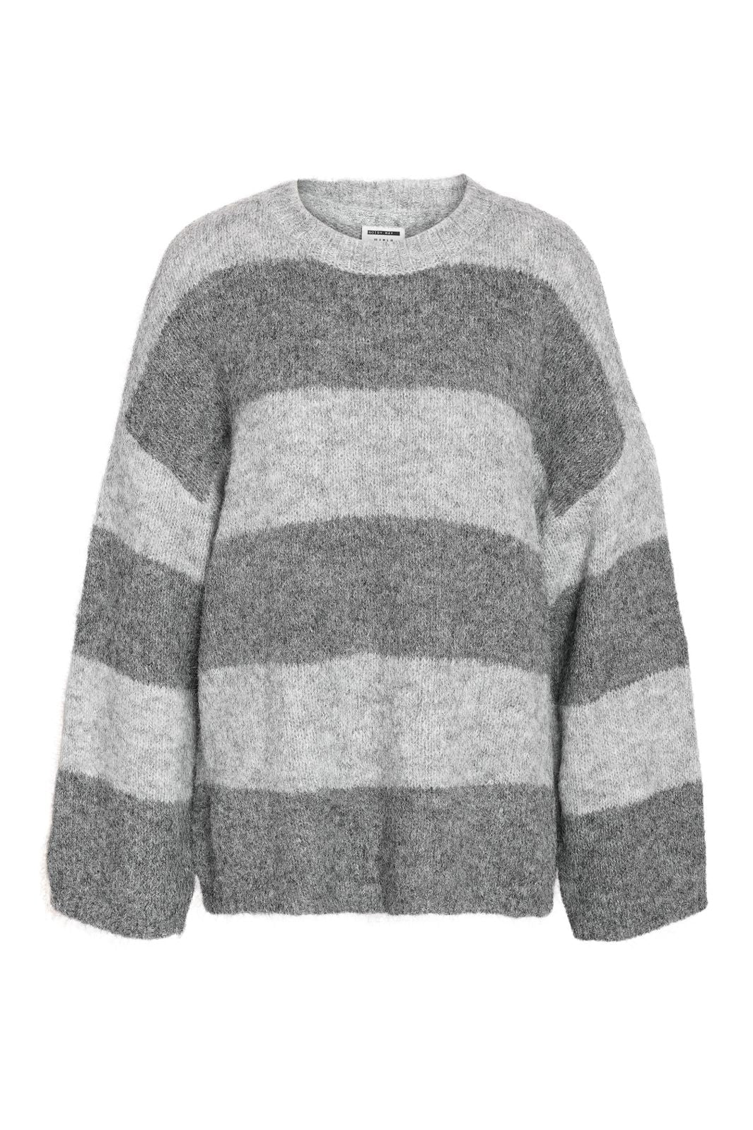 Gestreifter Strickpullover von Noisy May in Grautönen. Der Strick hat eine Oversize-Passform mit langen Ärmeln und rundem Halsausschnitt. Der weiche Strick hat breite horizontale Streifen in hellen und mittelgrauen Tönen.