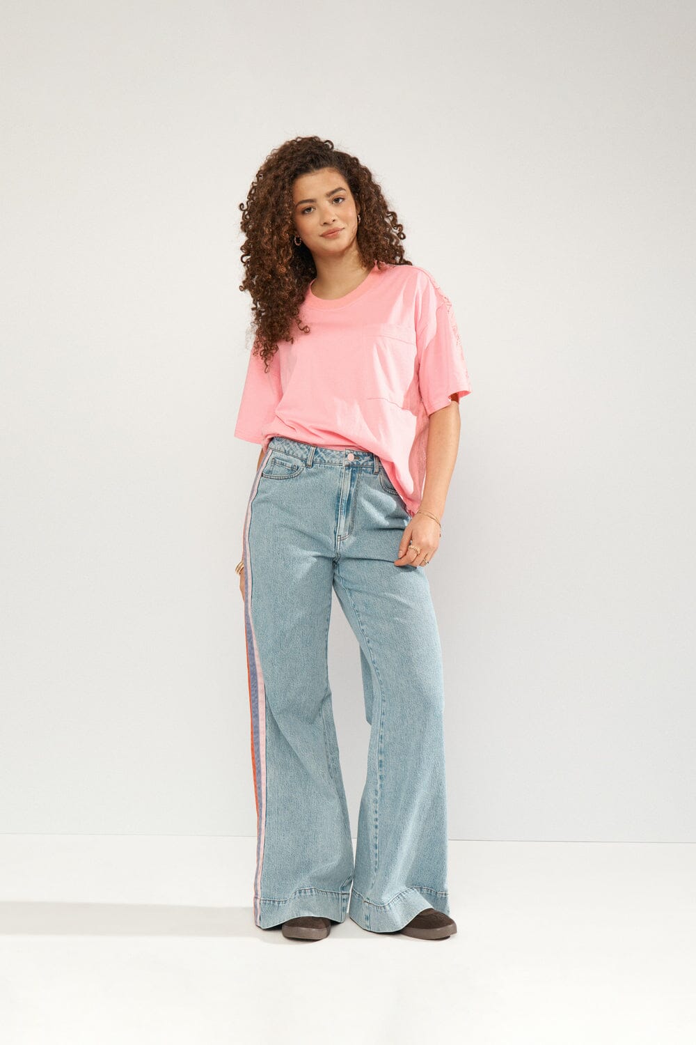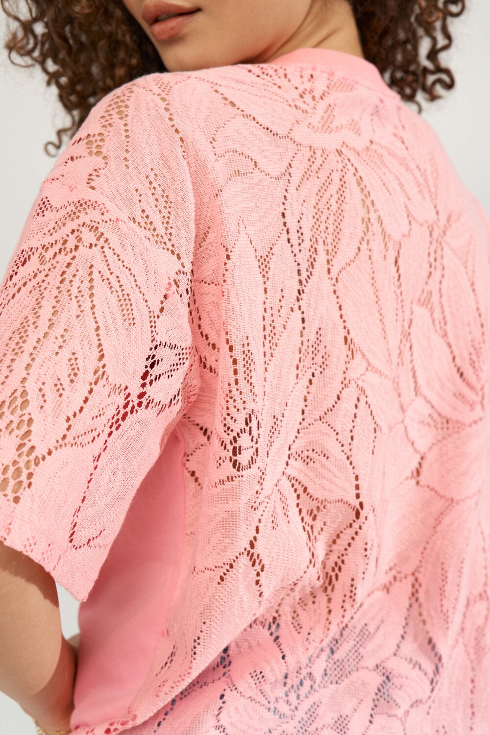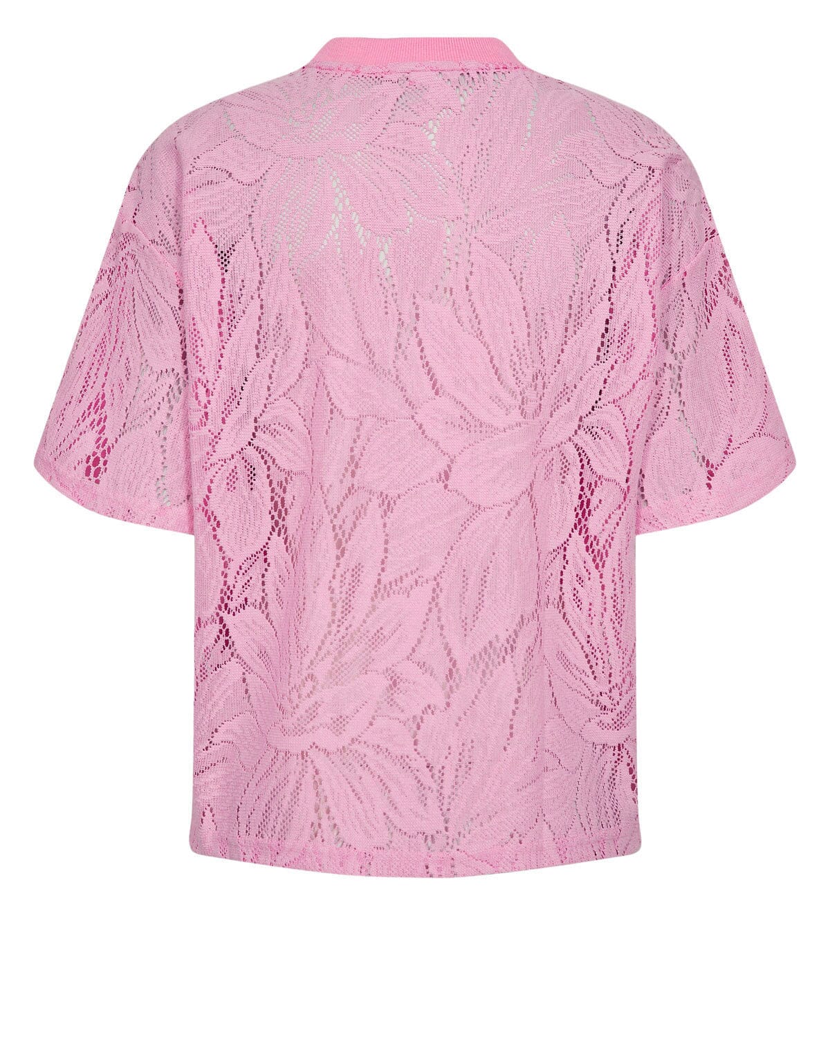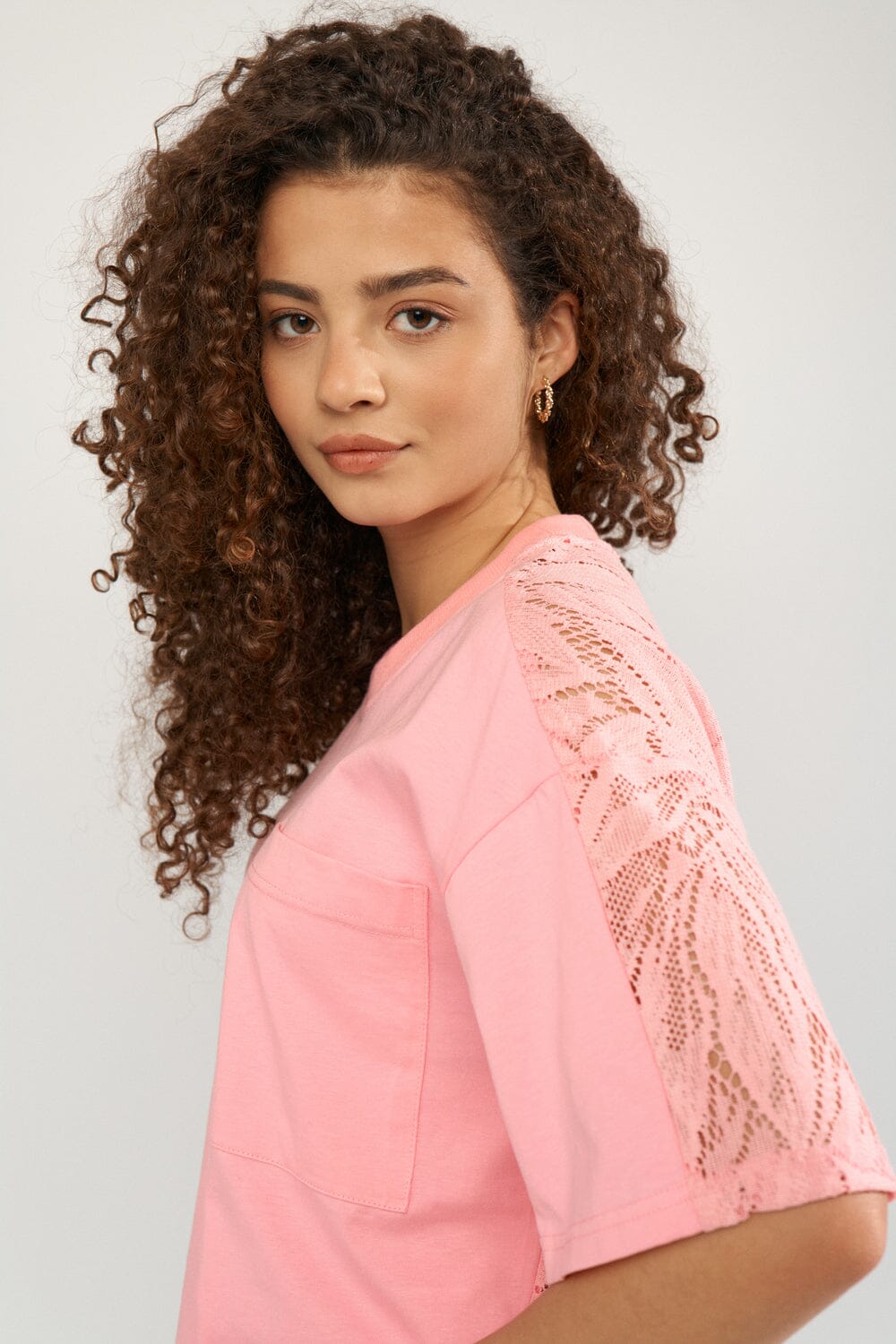 Rosa T-Shirt von Nümph mit Spitze an den Ärmeln und am Rücken. Sie hat einen Rundhalsausschnitt und eine Brusttasche auf der Vorderseite.