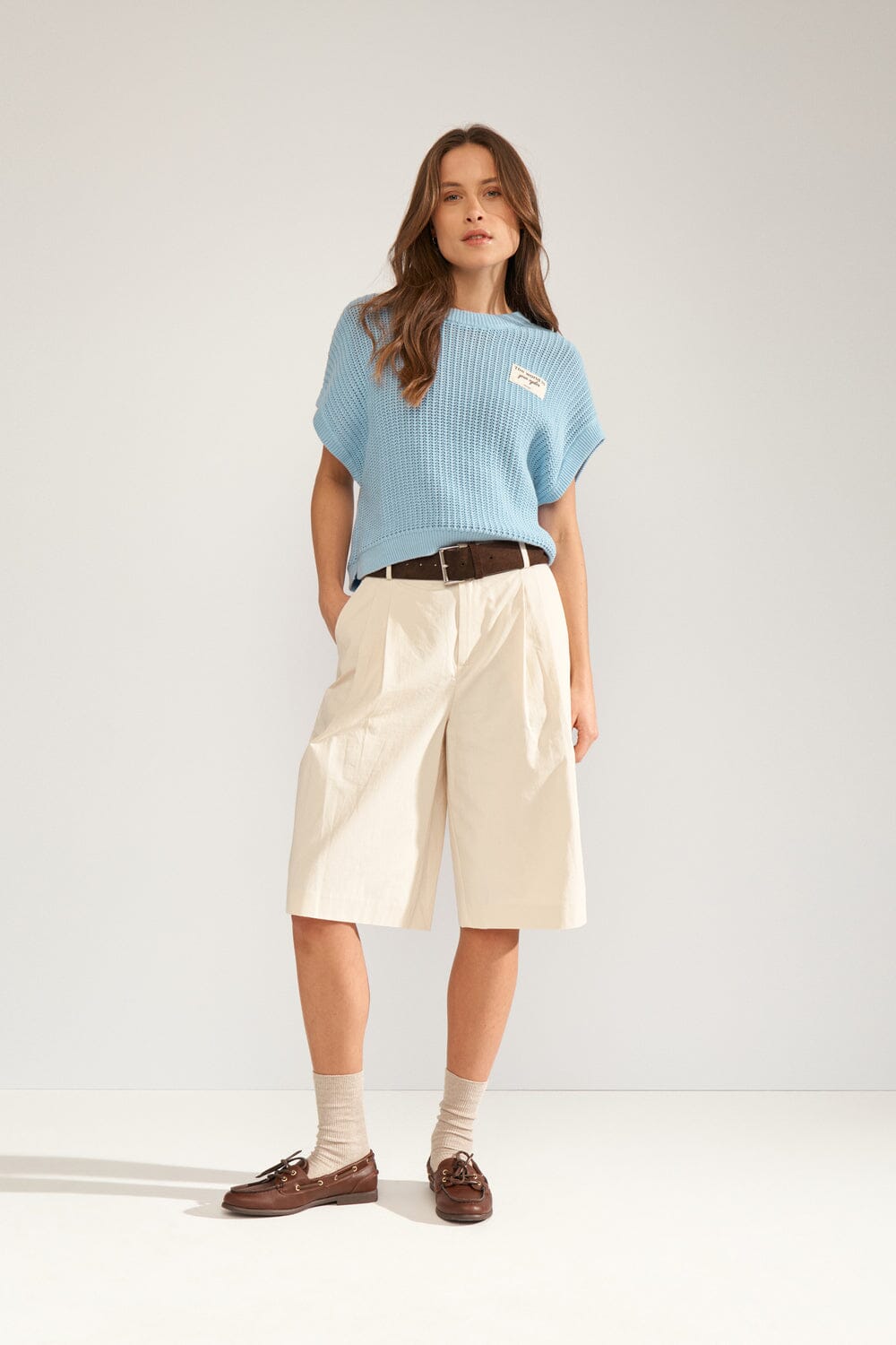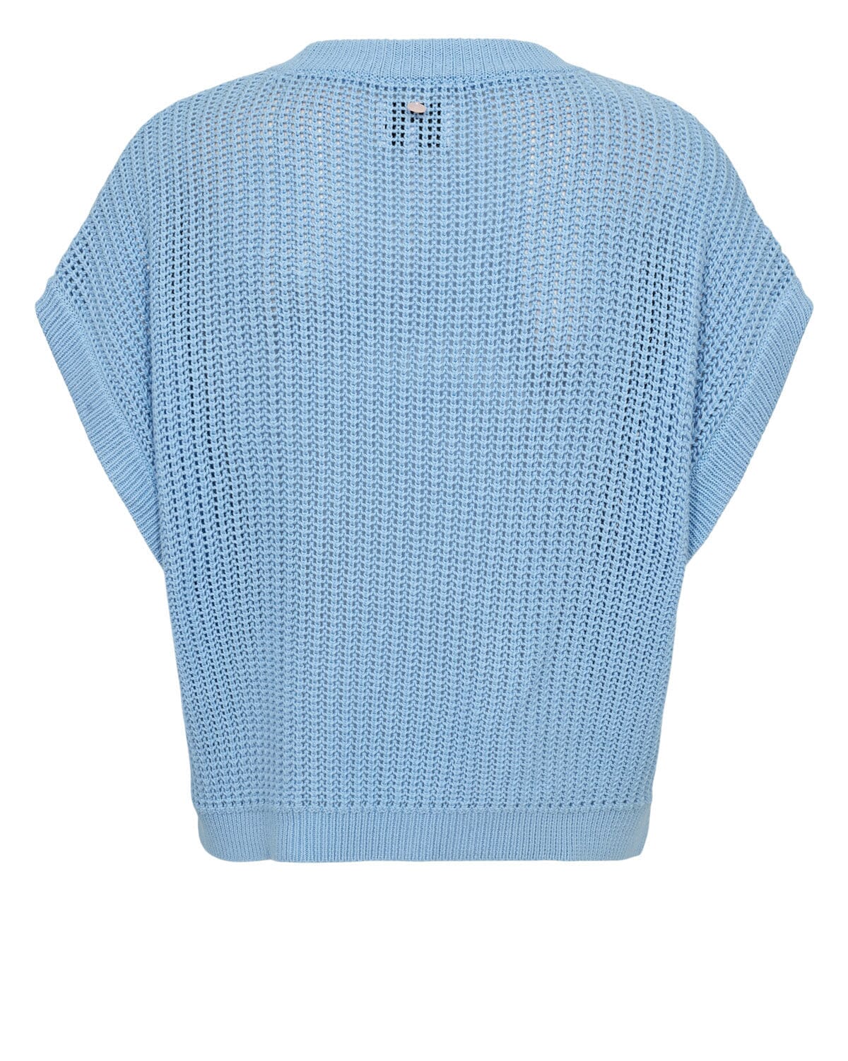 Hellblaue Pullover von Nümph, aus Baumwolle mit einer strukturierten Strickoptik. Der Pullover hat kurze Ärmel und einen Rundhalsausschnitt.